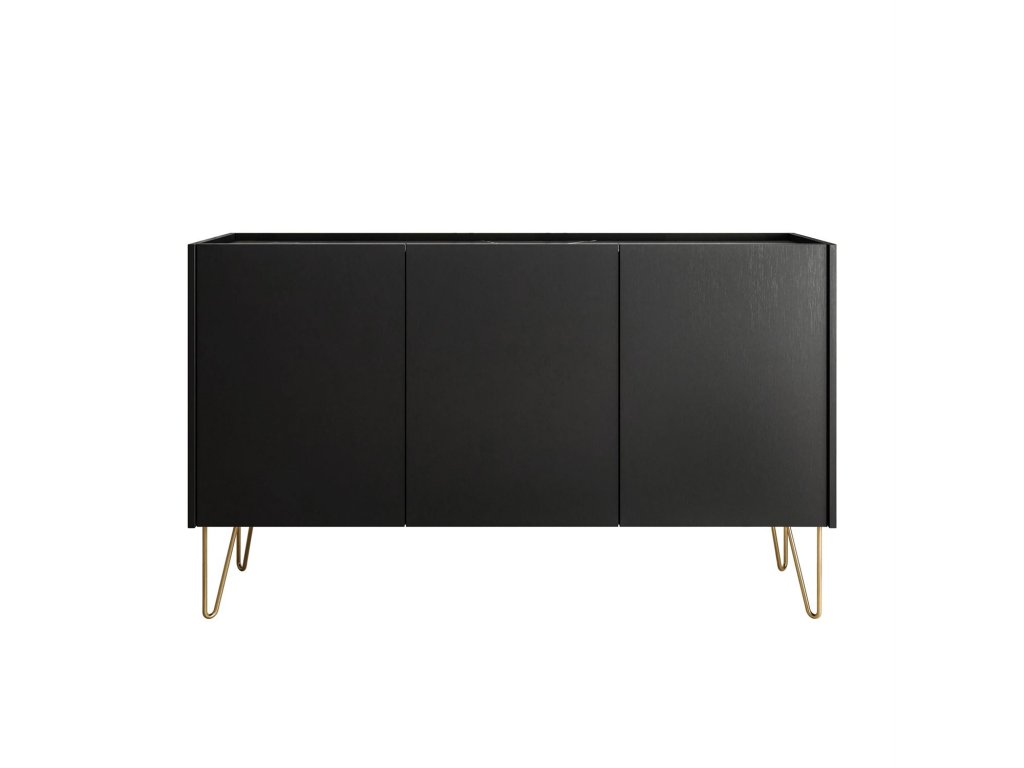 Moderná komoda Europa v odtieni čierny grafit kde vrchná časť je vo farbe čierny mramor postavená na zlatých kovových nožičkách.