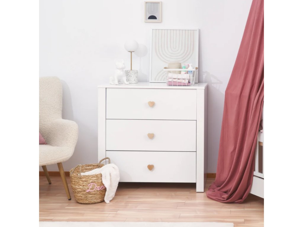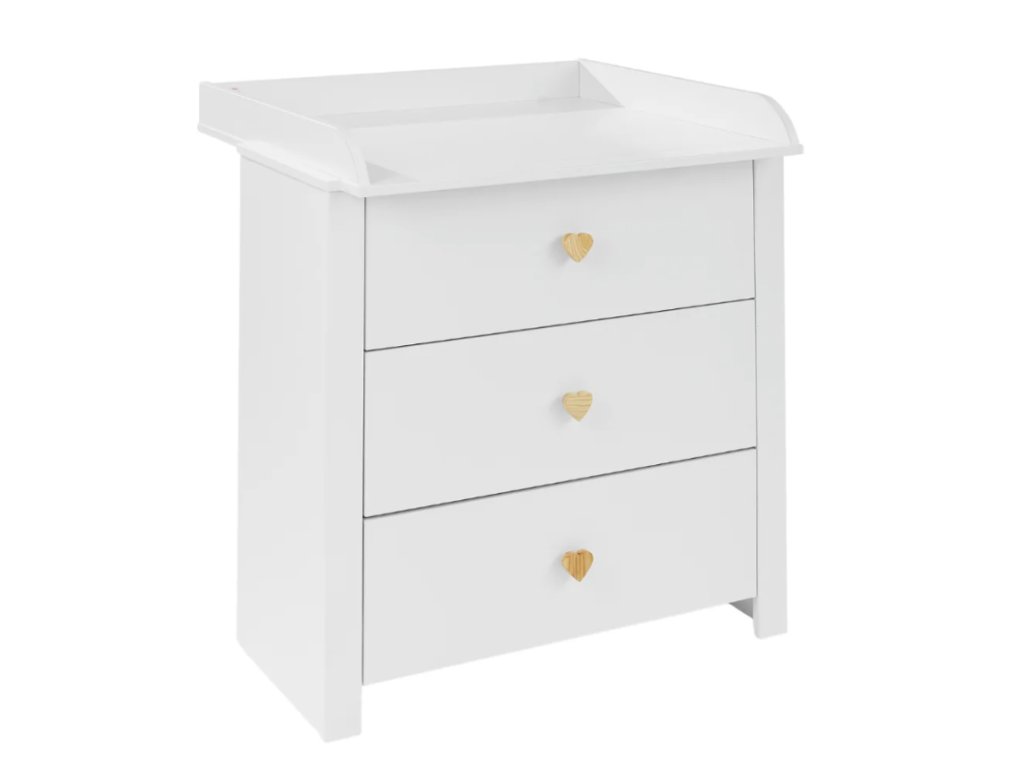Komoda je vyrobená z najkvalitnejších materiálov, čo zaručuje trvácnosť a odolnosť voči poškodeniu. Jej elegantný dizajn v kombinácii s úchytkami v tvare srdca jej dodáva jedinečné čaro a robí z nej perfektný doplnok do detskej izby. Komoda má navyše tri priestranné zásuvky , ktoré sú ideálne na uloženie detského oblečenia a doplnkov. Vďaka tomu je všetko vždy na svojom mieste, čo uľahčuje organizáciu a údržbu miestnosti. Prebaľovací pult sa dá ľahko vybrať bez toho, aby na pracovnej doske zostali akékoľvek stopy.