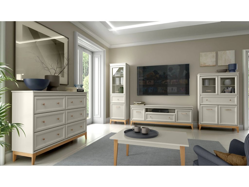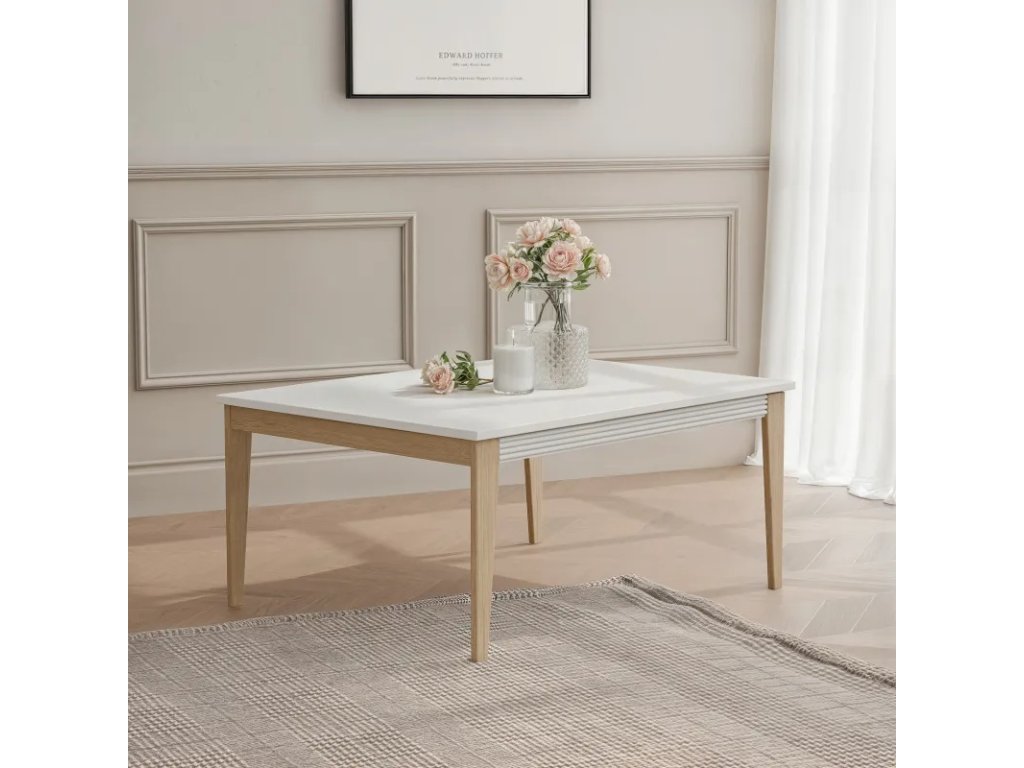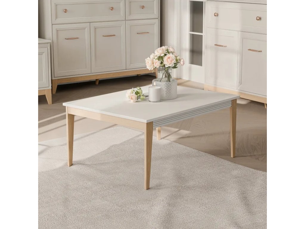 Jeho najväčšou výhodou je elegantné, dekoratívne frézovanie pod doskou stola – decentný pás, ktorý dodáva celej konštrukcii ľahkosť a zdôrazňuje štýl kolekcie WINDSOR. Konferenčný stolík je vyhotovený v teplom, svetlom odtieni kašmíru a jeho pevné nohy z masívneho dubového dreva vytvárajú príjemný kontrast, ktorý zdôrazňuje prirodzený charakter stola.