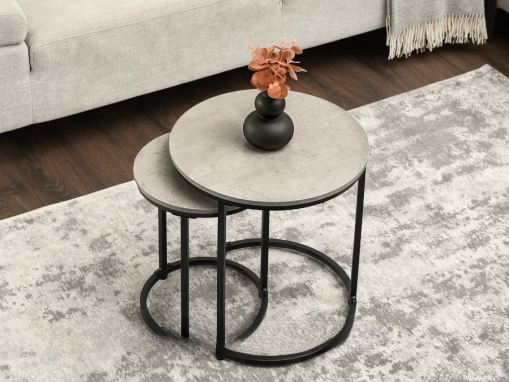 Industriálny charakter konferenčnej súpravy DUNCAN MINI 1 dokonale dopĺňa moderné a loftové interiéry, kde surové materiály a minimalistické tvary vytvárajú jedinečnú atmosféru. Okrúhle dosky stolov dodávajú ľahkosť a harmóniu, zatiaľ čo čierne kovové podnože dodávajú stolu osobitý charakter. Stoly sa bezproblémovo spájajú s prírodnými látkami, betónovými detailmi a kovovými prvkami, čím vytvárajú ucelený a štýlový priestor v obývačke alebo kancelárii.