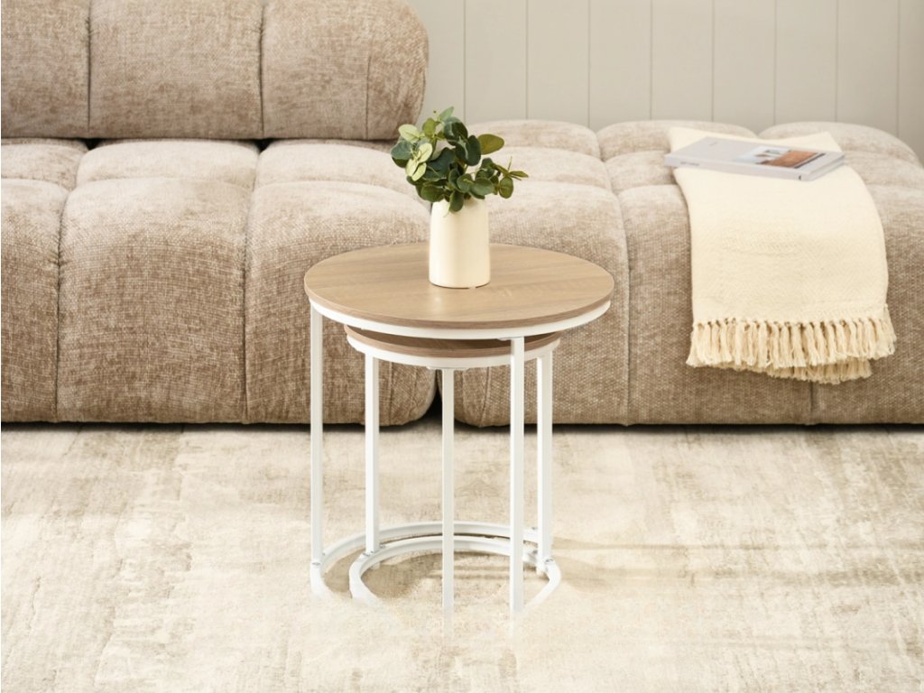 Konferenčné stolíky DUNCAN MINI sú mimoriadne praktickou súpravou dvoch okrúhlych stolíkov, ktoré je možné umiestniť vedľa seba alebo samostatne, čím si prispôsobíte priestor vašim aktuálnym potrebám. Dosky stola o 45 cm väčšie a o 32 cm menšie poskytujú pohodlné miesto na odloženie kávy, knihy alebo dekorácií. Nastaviteľné ochranné nožičky zaisťujú stabilitu na rôznych povrchoch a chránia podlahu pred poškriabaním. Tento kus nábytku kombinuje funkčnosť s komfortom a zvyšuje každodenné pohodlie v každom interiéri.