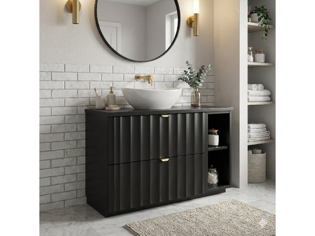 Hľadáte do svojej kúpeľne prvok, ktorý je nielen praktický, ale okamžite zaujme dizajnom? Kúpeľňová skrinka MERY s regálom v sýtej čiernej farbe je dokonalým riešením pre moderné a industriálne ladené interiéry.