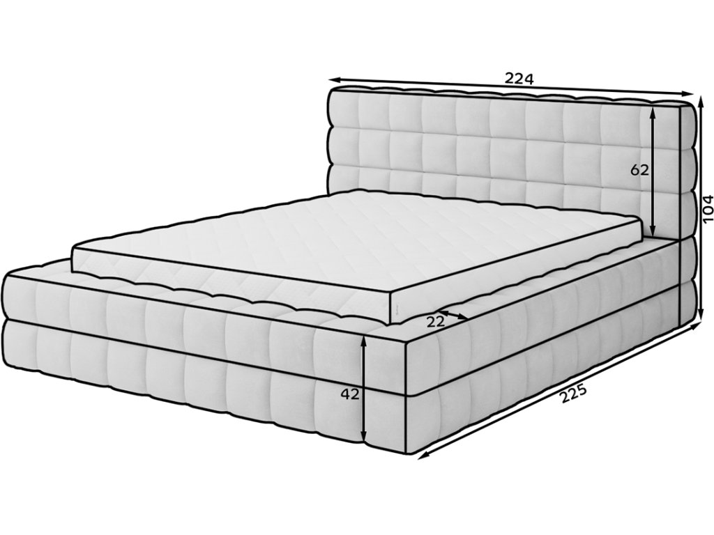 Dĺžka postele 244 cm a pôsobivá výška 104 cm jej dodávajú jedinečný charakter. Výška sedadla je 42 cm, ale pre dosiahnutie plného pohodlia počas používania odporúčame pridať matrac. Čierne plastové nohy s výškou 2 cm zabezpečujú, že celá konštrukcia je stabilná a zároveň ľahká.
