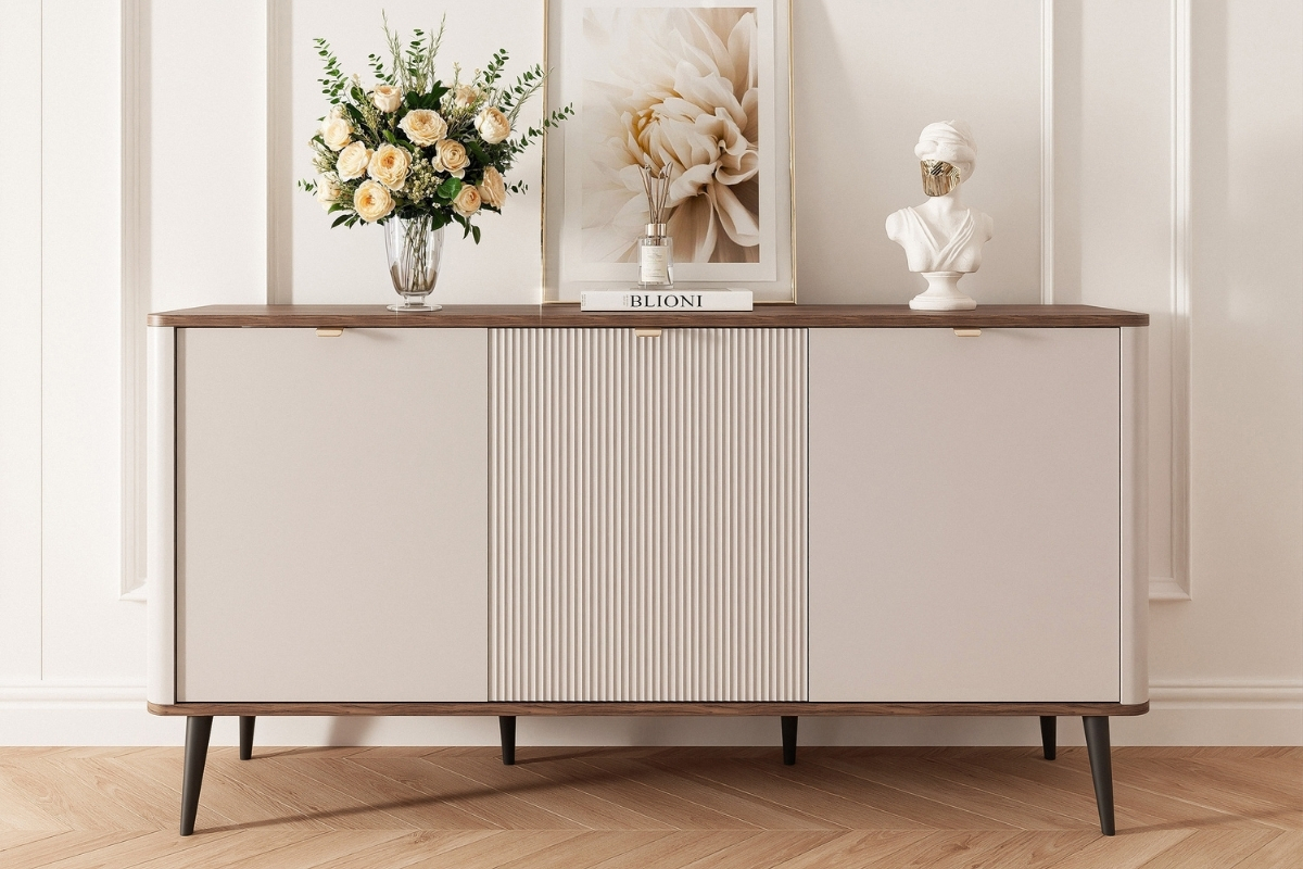Trojdverová komoda z kolekcie NICOLA s ryhovanými prednými stranami vo farbe kašmíru, vybavená systémom tlmeného zatvárania, kombinuje eleganciu s funkčnosťou a ponúka priestranný interiér s policami, ktoré uľahčujú organizáciu a uloženie potrebných vecí.