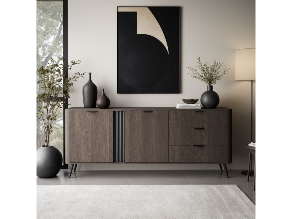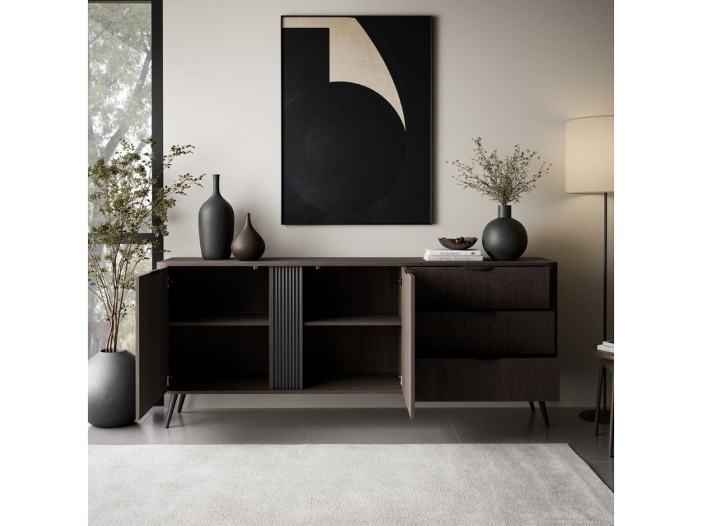 Komoda RICKY zaujme unikátnou kombináciou chladných drevených tónov s výraznými čiernymi akcentmi. Dominantným prvkom je ozdobná drážkovaná vložka, ktorá dodáva nábytku hĺbku a umelecký charakter. Štíhle kovové nohy opticky odľahčujú celú konštrukciu, vďaka čomu sa komoda perfektne hodí do interiérov v štýle: