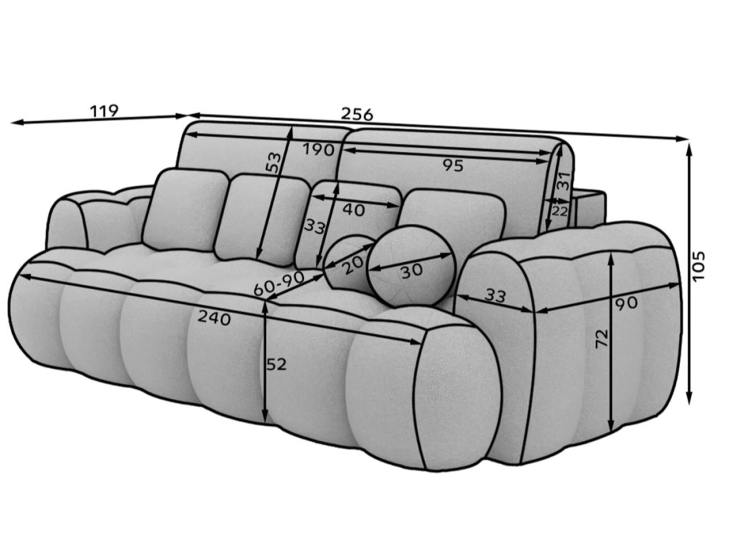 Výška [cm]: 105 Hĺbka [cm]: 119 Šírka [cm]: 256 Štýl: Moderný Materiál čalúnenia: Polyester Šírka sedadla [cm]: 190 Výška sedadla [cm]: 52 Hĺbka sedadla [cm]: 90 Kapacita sedadiel: 3 Nosnosť [kg]: 250 Funkcia spánku: pravda