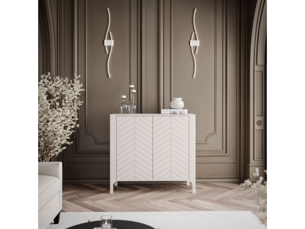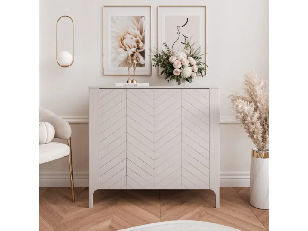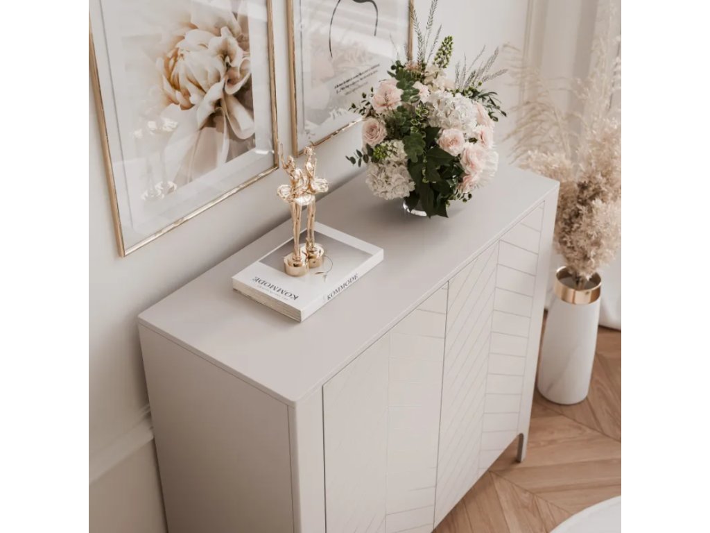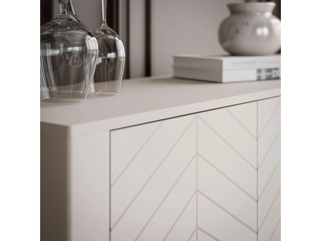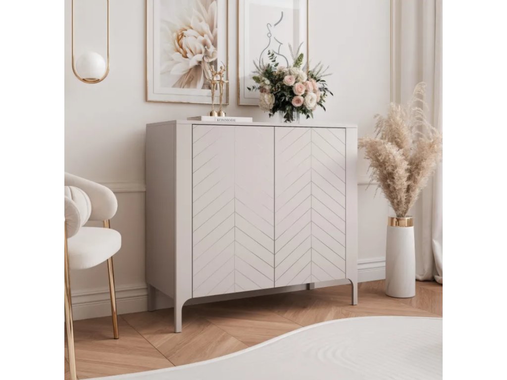 Nábytok z tejto série sa vyznačuje precíznym remeselným spracovaním a prepracovanými detailmi, ktoré mu dodávajú jedinečný charakter. Výrazné predné strany zdobené UV potlačou v tvare rybej kosti dodávajú hĺbku, zatiaľ čo štíhle kovové nohy dodávajú nádych ľahkosti a jednoduchého čistenia. Kolekcia je dostupná v dvoch farebných prevedeniach – kašmírovo matnej a čiernej s viditeľnou drevnou štruktúrou , vďaka čomu sa nábytok hodí do rôznych interiérových dizajnov.
