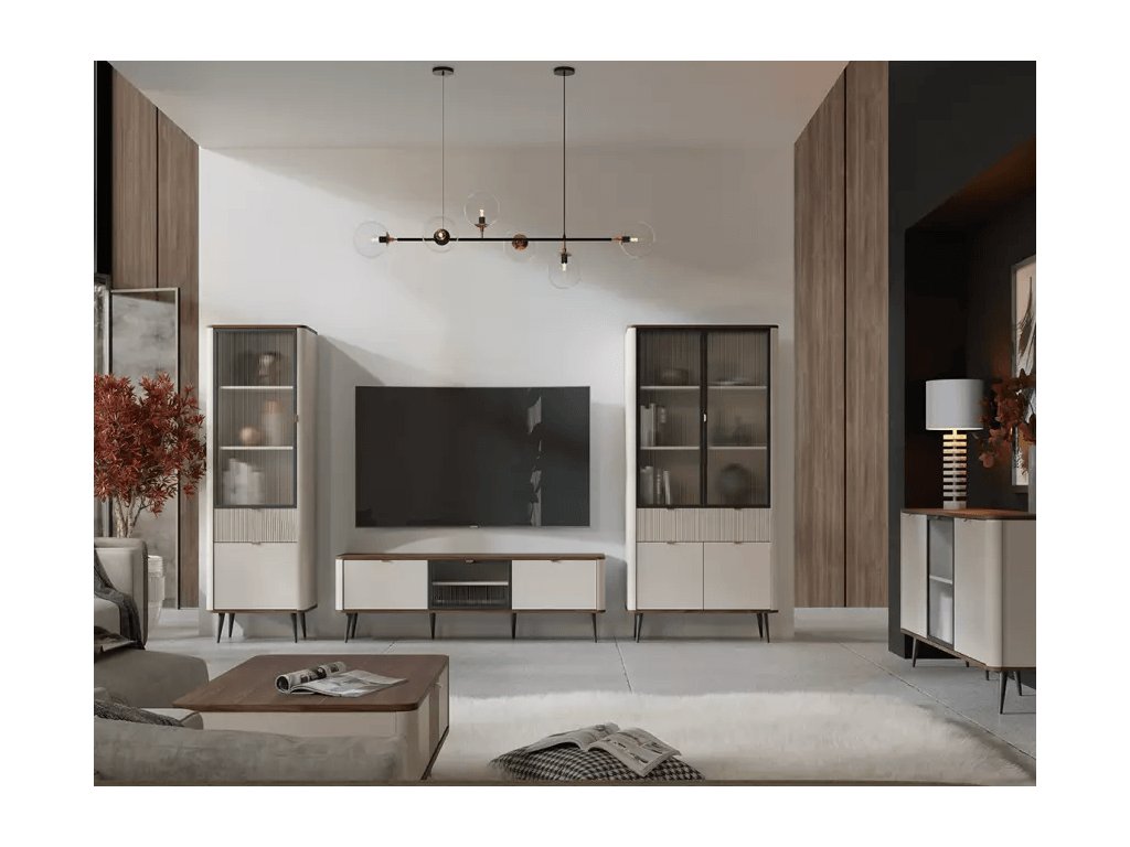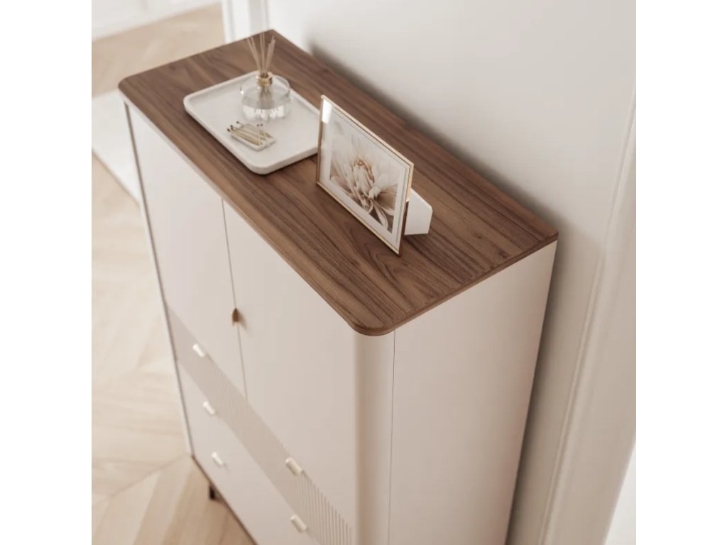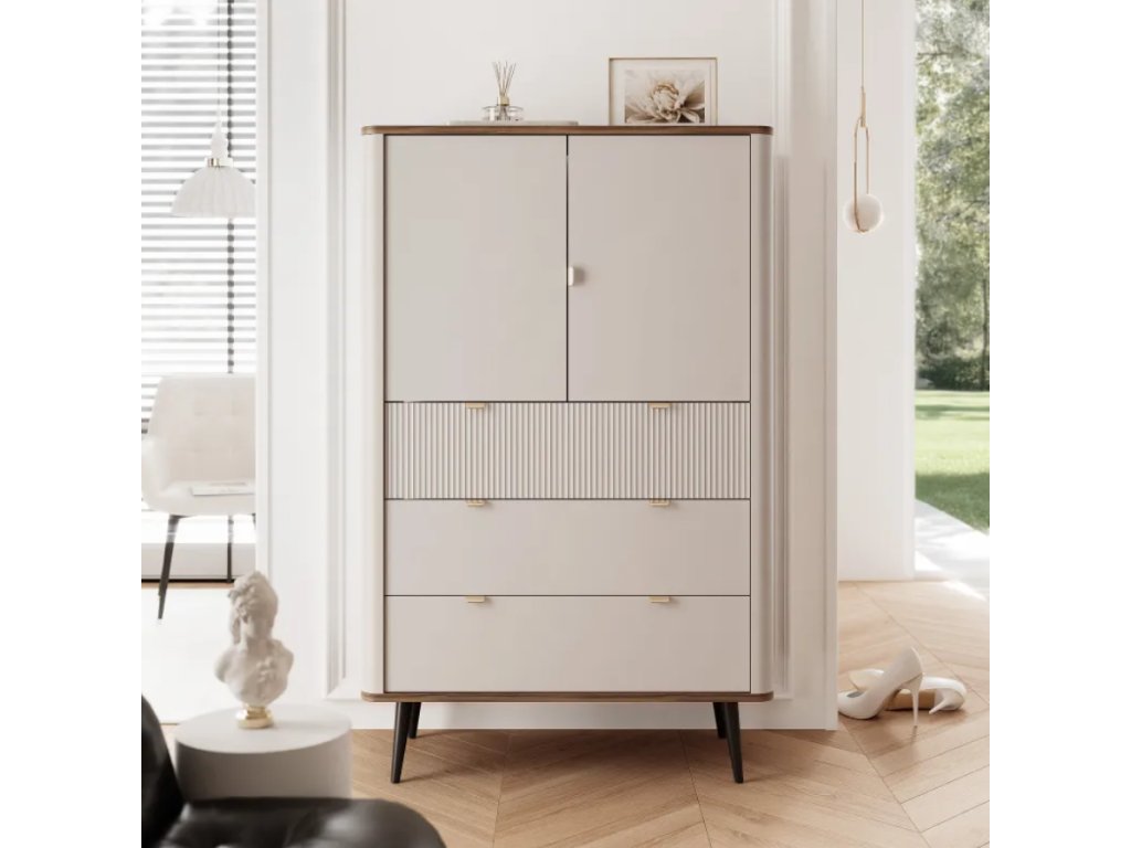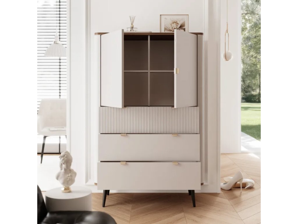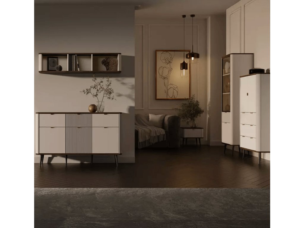 Uzavretá polica z kolekcie NICOLE , vybavená tromi zásuvkami, skrinkou s policou a mechanizmom tlmeného zatvárania, je elegantným a praktickým doplnkom interiéru, ktorý spája štýl s funkčnosťou.