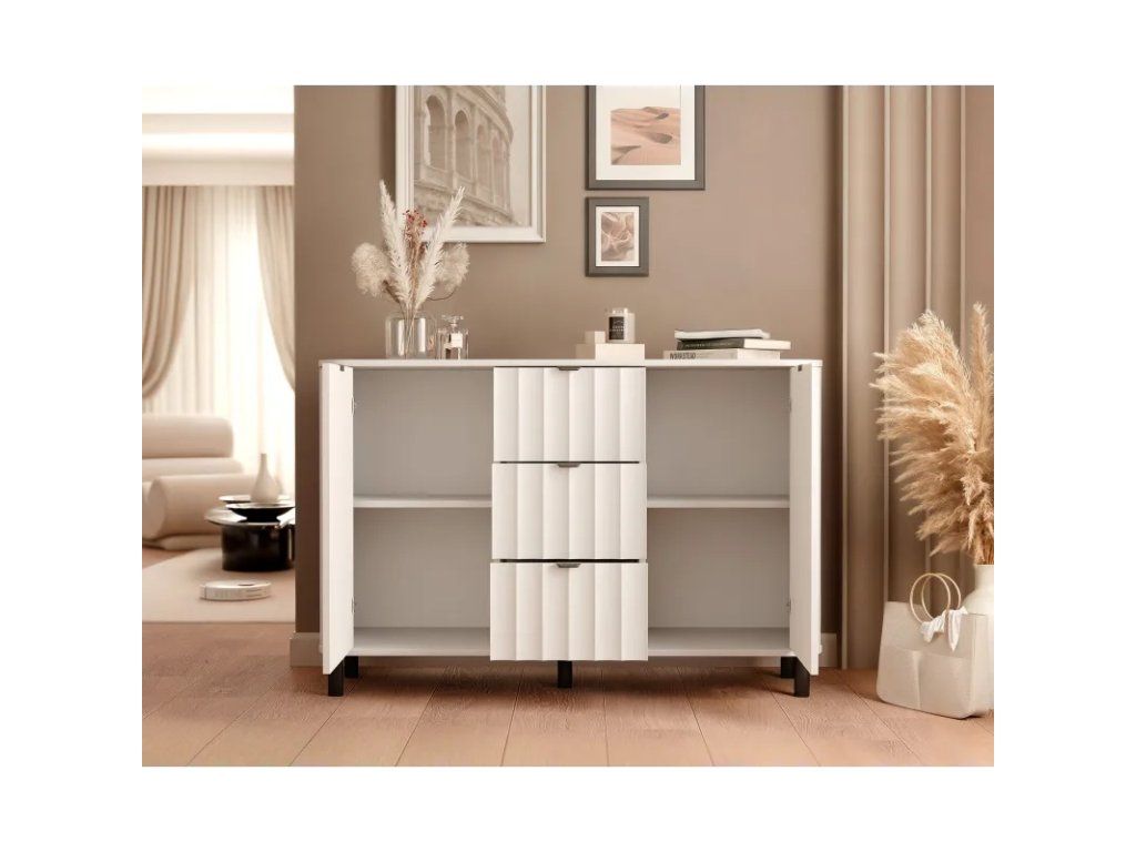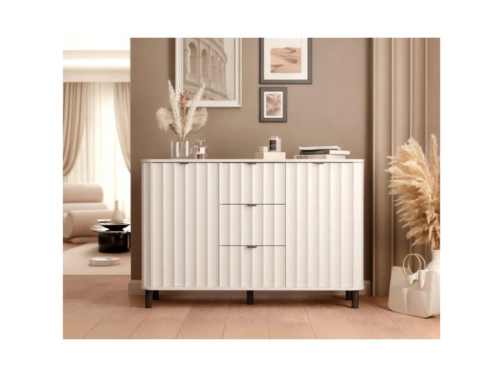 Komoda ONUR je moderný kus nábytku s minimalistickým dizajnom a elegantnou povrchovou úpravou, ktorý dokonale dopĺňa štýlové interiéry. Dostupná v dvoch farebných variantoch – klasickej bielej a módnom odtieni hliněnej sivej – ľahko ju zladíte s vašou obývačkou, spálňou alebo chodbou. Frézované čelá dodávajú kusu jemný dekoratívny nádych a zdôrazňujú jeho jedinečný štýl, zatiaľ čo čierne kovové úchytky a štíhle nohy dodávajú ľahký a moderný nádych. Interiér komody je mimoriadne funkčný – obsahuje tri zásuvky, ideálne na drobnosti a doplnky, a skrinky s policami na uloženie väčších predmetov. Komoda ONUR je vyrobená z masívnych, laminovaných MDF dosiek , odolných voči vlhkosti a každodennému používaniu, čo zaisťuje odolnosť a dlhotrvajúcu estetiku. Tento kus nábytku kombinuje štýl, praktickosť a solídne spracovanie , takže sa perfektne hodí do každého moderného interiéru.