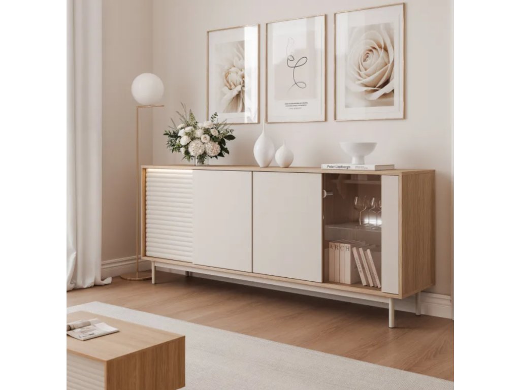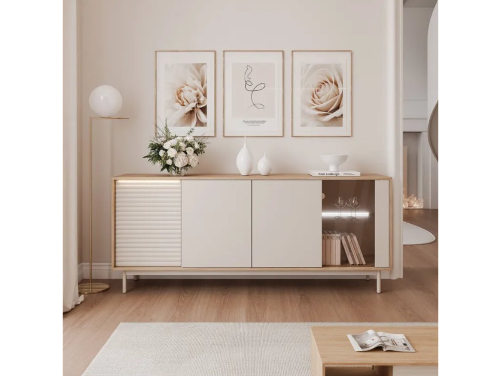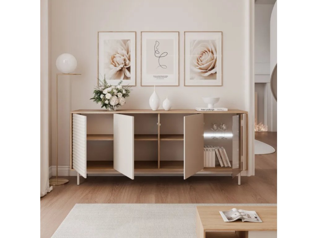 Štvordverová príborník QUENTIN je elegantný kus nábytku, ktorý kombinuje moderný štýl, vysoko kvalitné remeselné spracovanie a praktické úložné riešenia. Korpus je vyrobený z odolnej laminovanej dosky odolnej voči poškriabaniu a poškodeniu. Predné časti z MDF majú ozdobné drážkované vložky a vstavané sklenené panely, ktoré dodávajú komôrke nádych ľahkosti a elegancie.