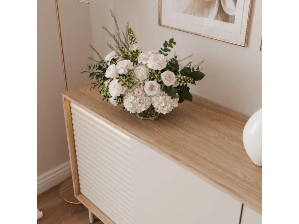 Systém otvárania push-to-open zaisťuje pohodlné používanie a zdôrazňuje minimalistický charakter komody. Štíhle kovové nohy dodávajú komode moderný vzhľad a uľahčujú udržiavanie poriadku na spodnej strane skrinky. Farebná schéma, ktorá kombinuje moderný olejovaný dub s kašmírovým odtieňom, robí z tejto komody perfektný doplnok do svetlých aj tmavých interiérov.