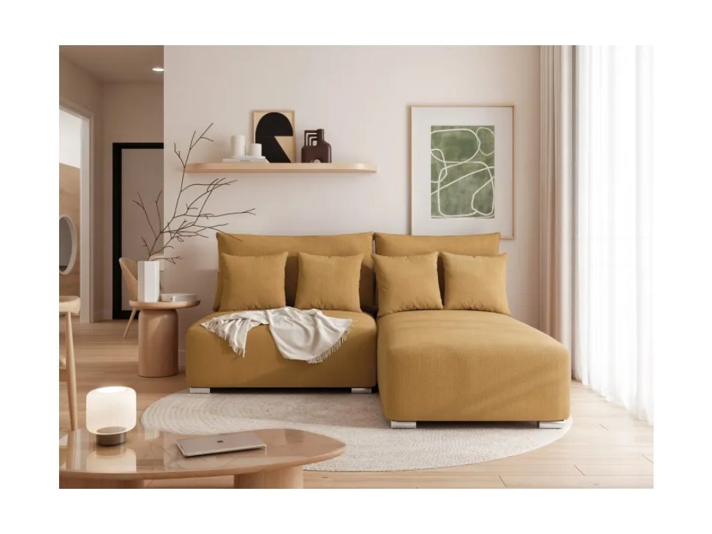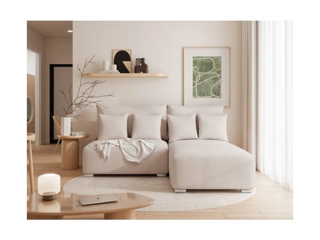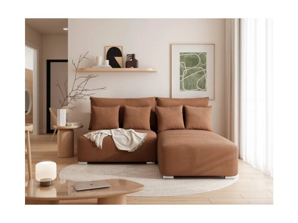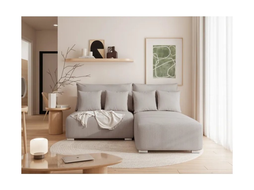 Rohová pohovka je voľne stojaca a jej operadlo je kompletne čalúnené látkou v rovnakej farbe , čo umožňuje jej umiestnenie kdekoľvek v miestnosti. Je dostupná v pravostrannej alebo ľavostrannej verzii , čo vám umožňuje prispôsobiť rohovú pohovku dispozičnému usporiadaniu vašej obývačky.