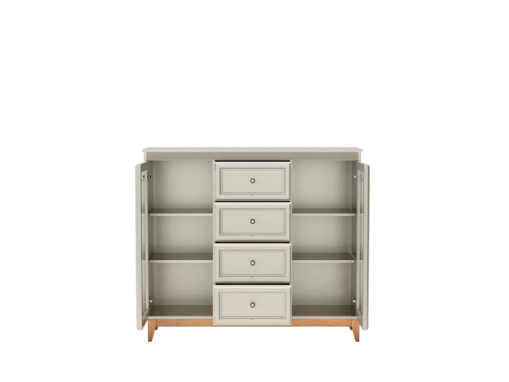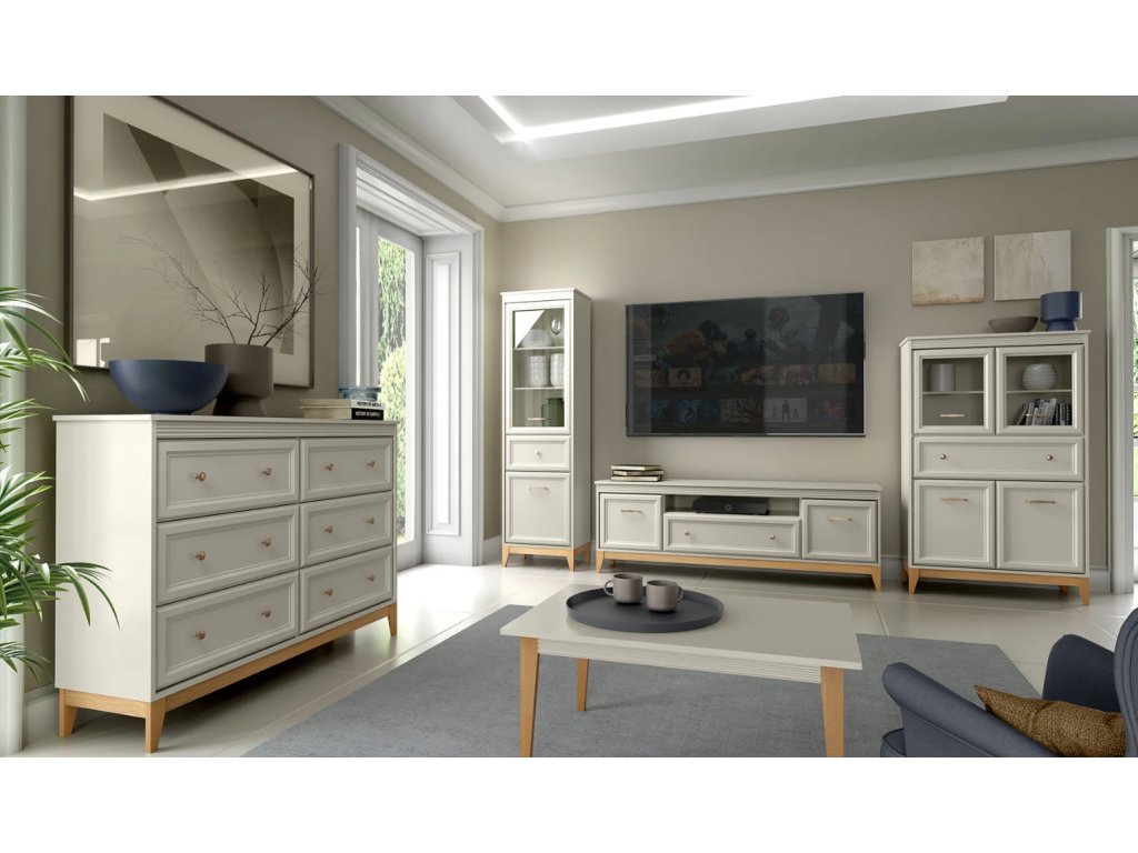 Je elegantná a funkčná vitrína , ktorá kombinuje klasickú estetiku s modernými riešeniami. Jeho jemné kašmírové farby v kombinácii s drevenými akcentmi vytvárajú harmonickú a útulnú atmosféru v každom interiéri. Vďaka premyslenému rozloženiu a vysoko kvalitnému spracovaniu sa vitrína bude perfektne hodiť do obývačky, jedálne alebo kancelárie, pričom bude slúžiť ako dekoratívna, tak aj praktická funkcia.