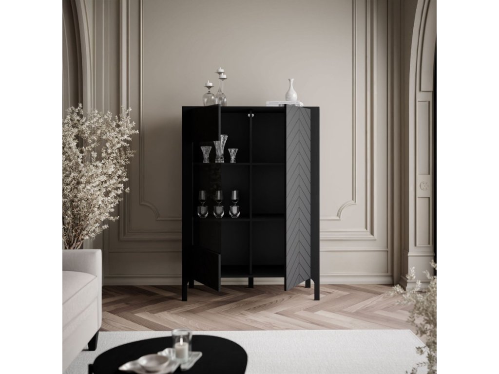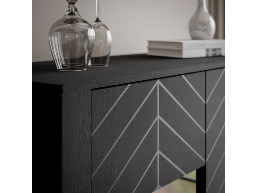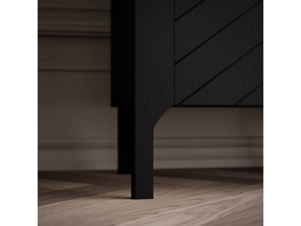Nábytok z tejto série sa vyznačuje precíznym remeselným spracovaním a prepracovanými detailmi, ktoré mu dodávajú jedinečný charakter. Výrazné predné strany zdobené UV potlačou v tvare rybej kosti dodávajú hĺbku, zatiaľ čo štíhle kovové nohy dodávajú nádych ľahkosti a jednoduchého čistenia. Kolekcia je dostupná v dvoch farebných prevedeniach – kašmírovo matnej a čiernej s viditeľnou drevnou štruktúrou , vďaka čomu sa nábytok hodí do rôznych interiérových dizajnov.
