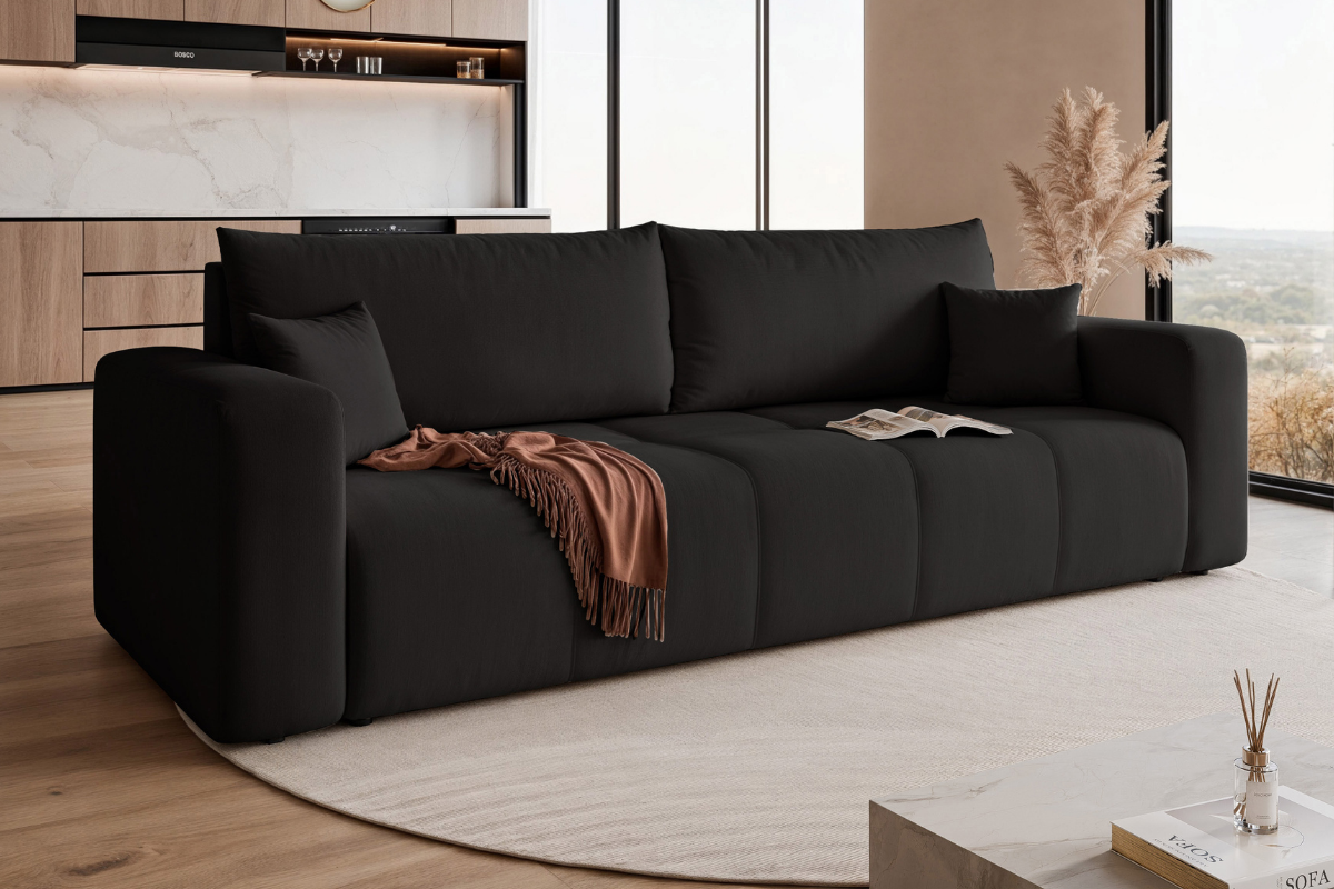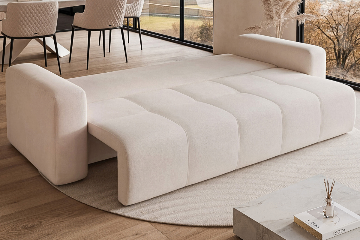 - Trojmiestna rozkladacia pohovka AMIR I zaujme nadčasovým dizajnom a ozdobným prešívaním na sedadle (glamour štýl).