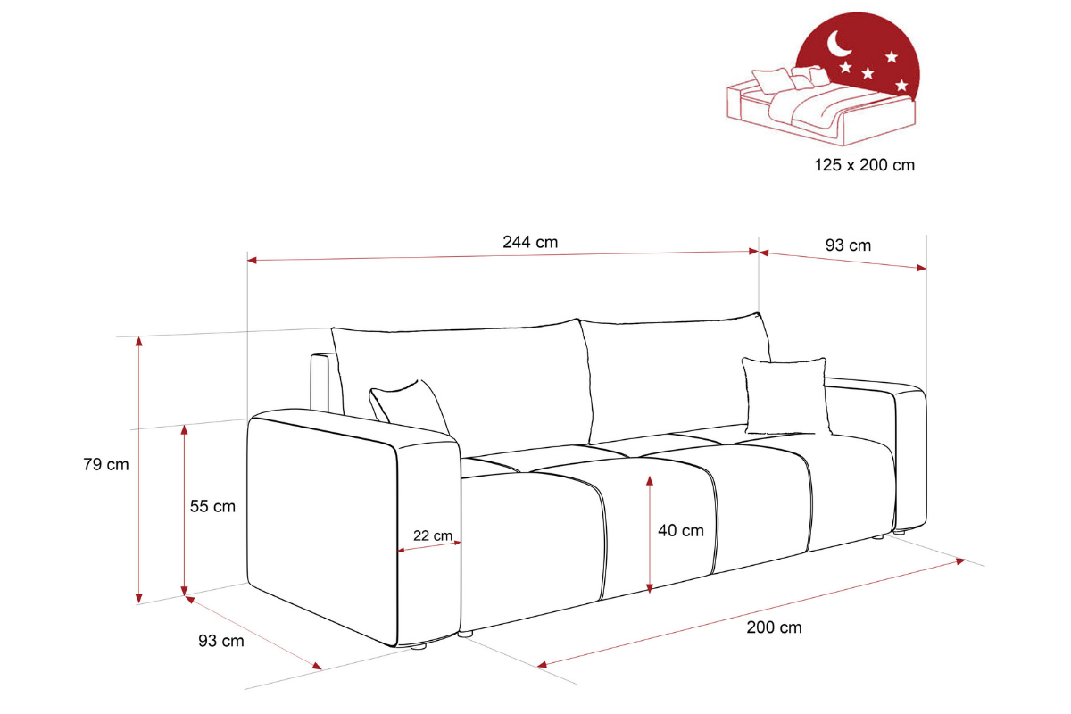 - Funkcia spánku - lôžko sa manuálne posúva dopredu, plocha na spanie má rozmer 140 × 200 cm.