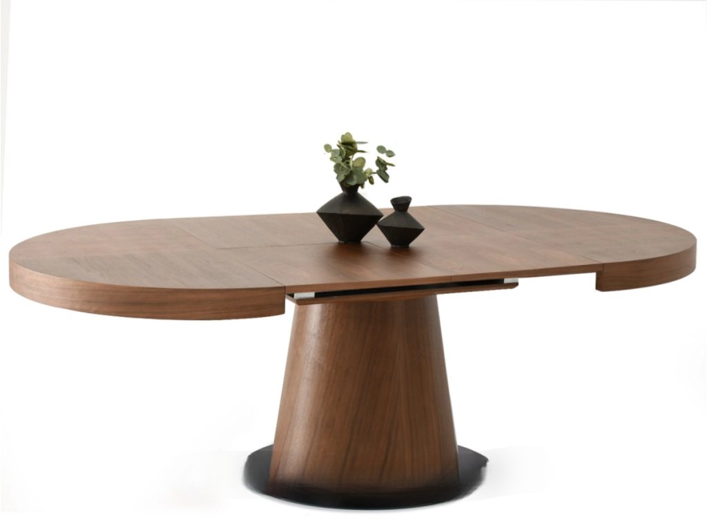 Stôl ADEN sa vyznačuje charakteristickou centrálnou základňou s masívnym, kužeľovitým tvarom, ktorý mu dodáva stabilitu a jedinečný vzhľad. Táto konštrukcia nielenže vyzerá pôsobivo, ale zaisťuje aj pohodlie pri používaní - absencia rohových nôh umožňuje voľné usporiadanie stoličiek okolo dosky stola. V spodnej časti je základňa zakončená čiernym, práškovo lakovaným kovovým okrajom , ktorý dodáva celku moderný akcent a elegantne kontrastuje s teplým odtieňom dreva. Je to detail, ktorý priťahuje pozornosť a zdôrazňuje dizajnérsky charakter nábytku.