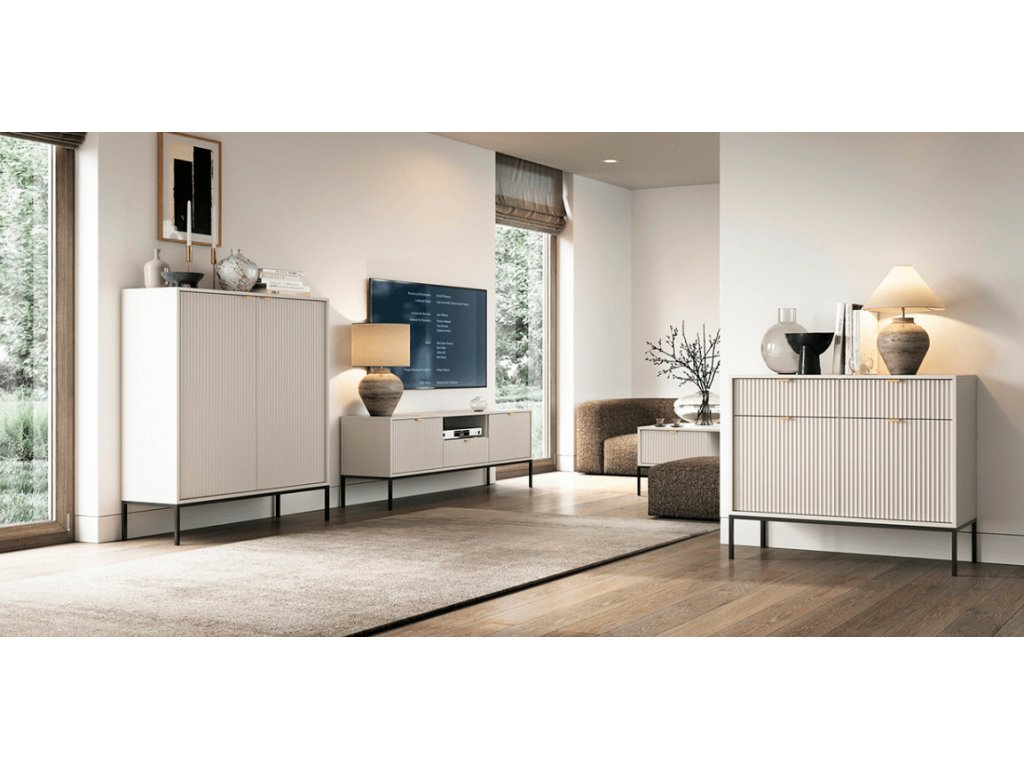 Moderný nočný stolík z kolekcie Cora v kašmirovej farbe so šuflíkom. Čierna kovová podnož.