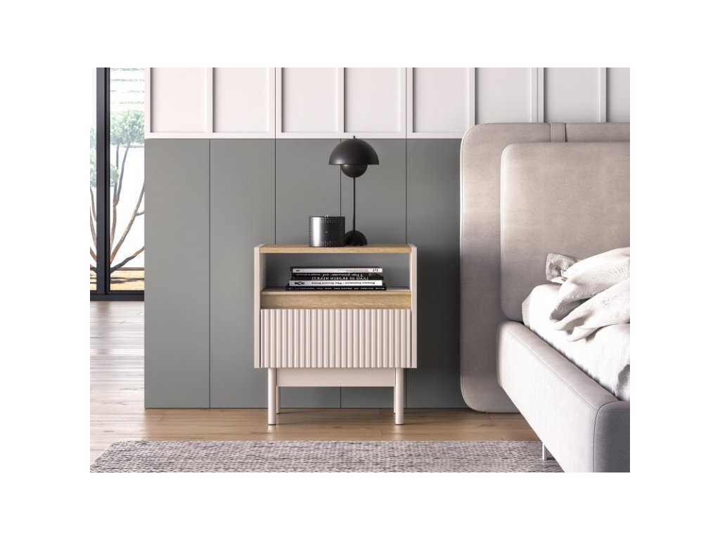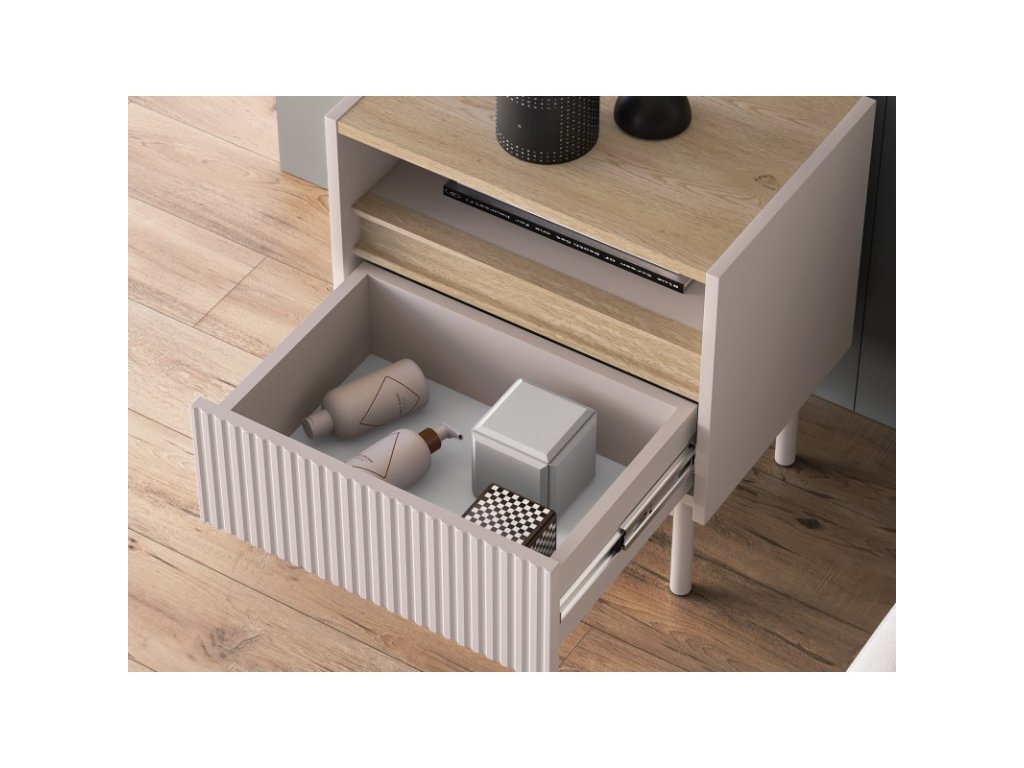 Nočný stolík LILAH je elegantný a funkčný kus nábytku, ktorý dokonale doplní priestor pri posteli v modernej spálni. Jeho decentná farebná schéma – kombinácia kašmíru a prírodného duba Cremona Torro – vnáša do interiéru teplo a harmóniu. Matný povrch a drážkované detaily prednej strany zdôrazňujú moderný charakter kolekcie.