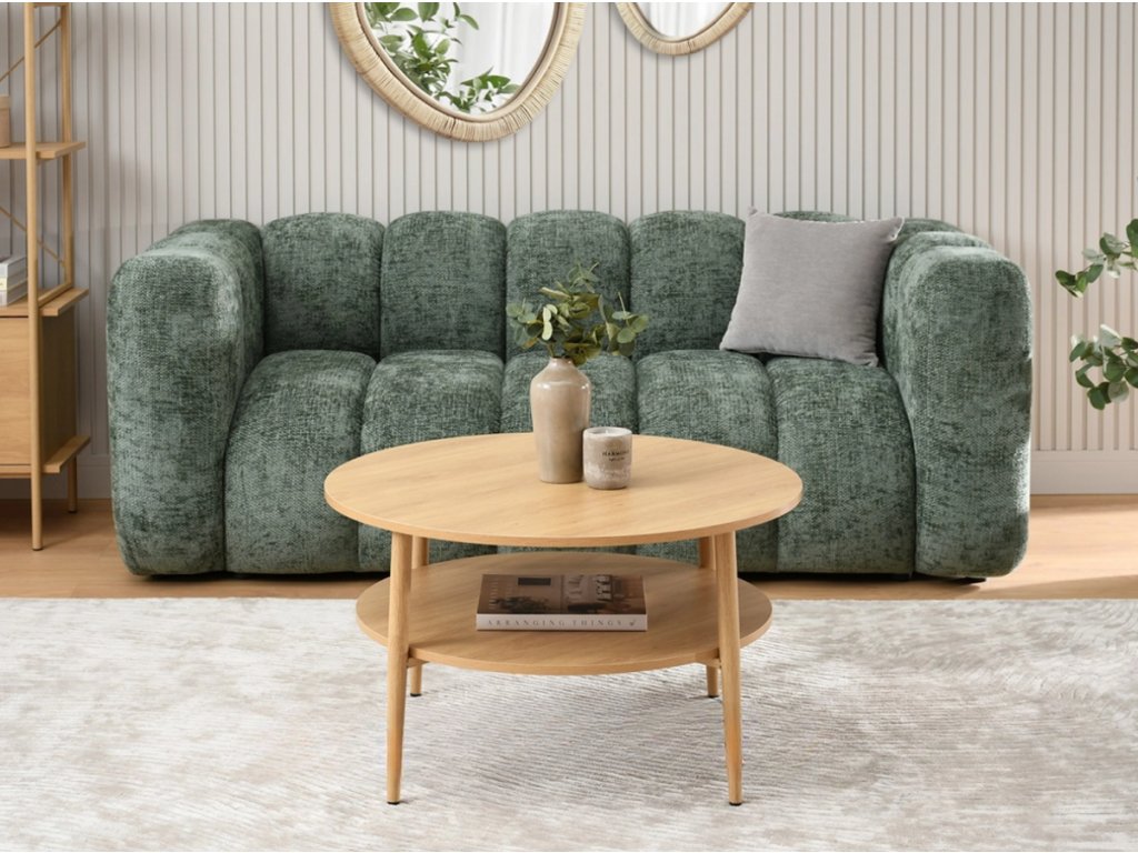 Doska stola, vyrobená z odolnej laminovanej dosky s textúrou dubového dreva, sa ľahko udržiava a je odolná voči každodennému používaniu. Jej veľká plocha bez problémov pojme všetko, čo potrebujete na relax – od kávových súprav až po dekorácie a knihy.