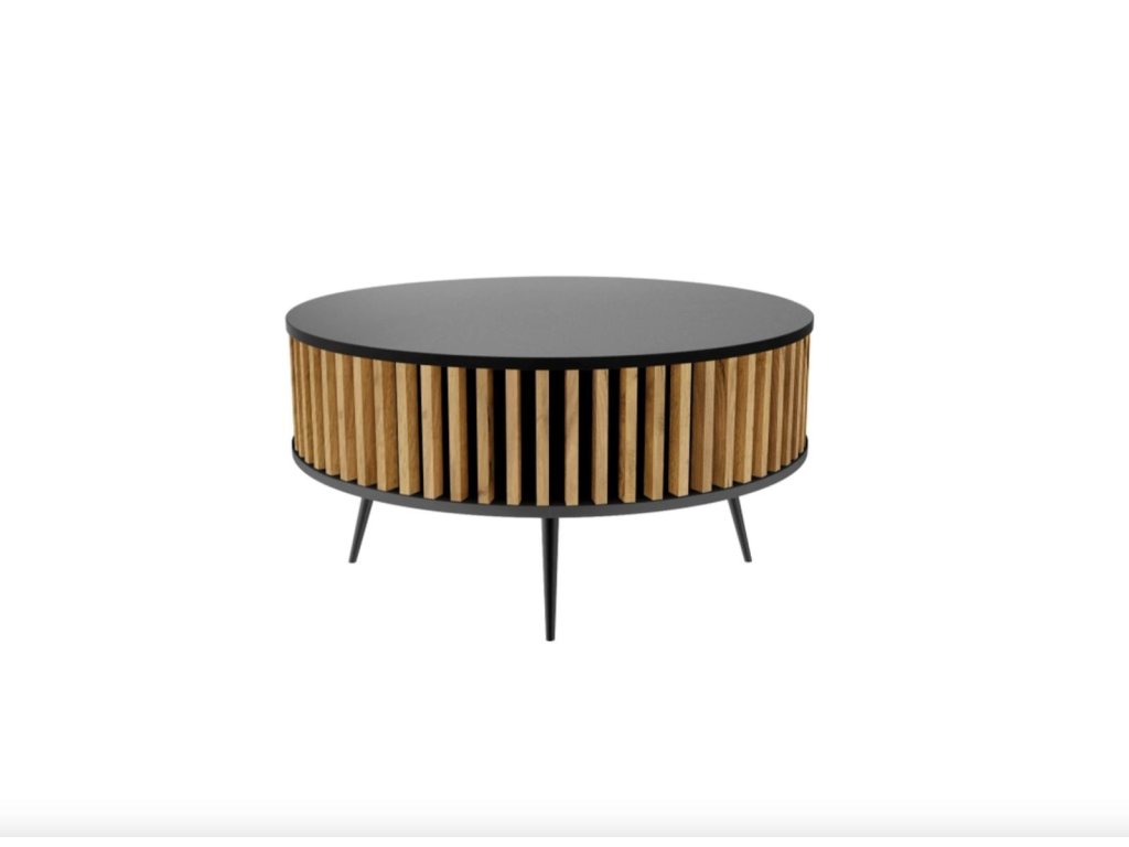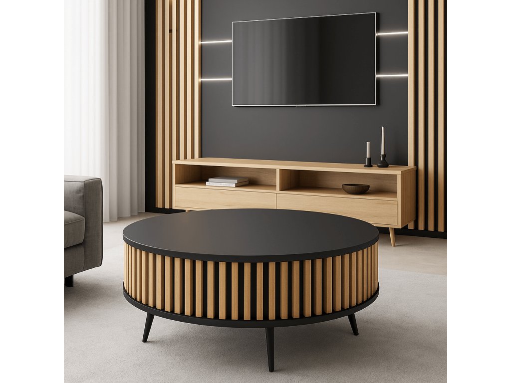 Okrúhly konferenčný stolík ELIOT s lamelami čierna matná + dub Artisan