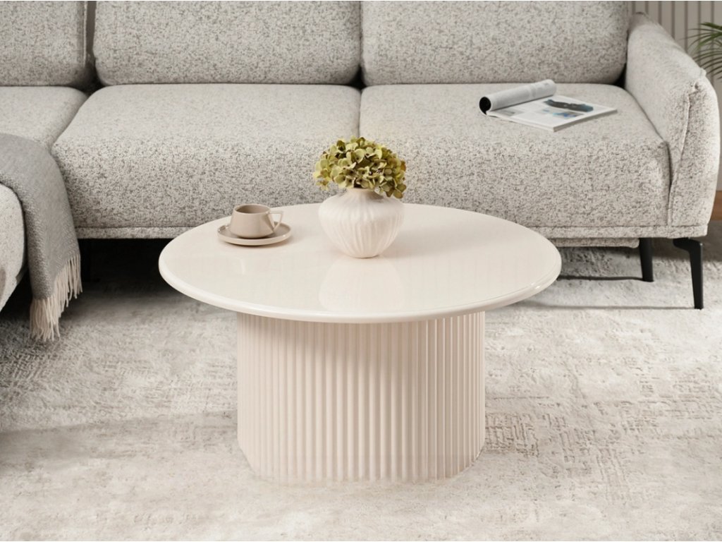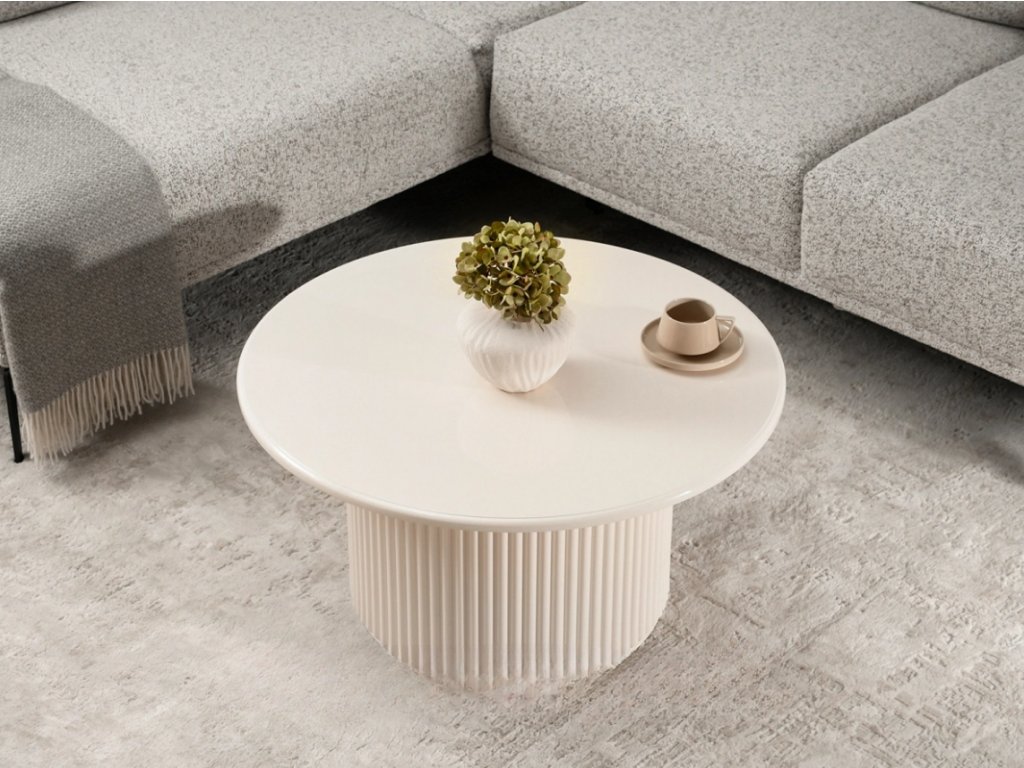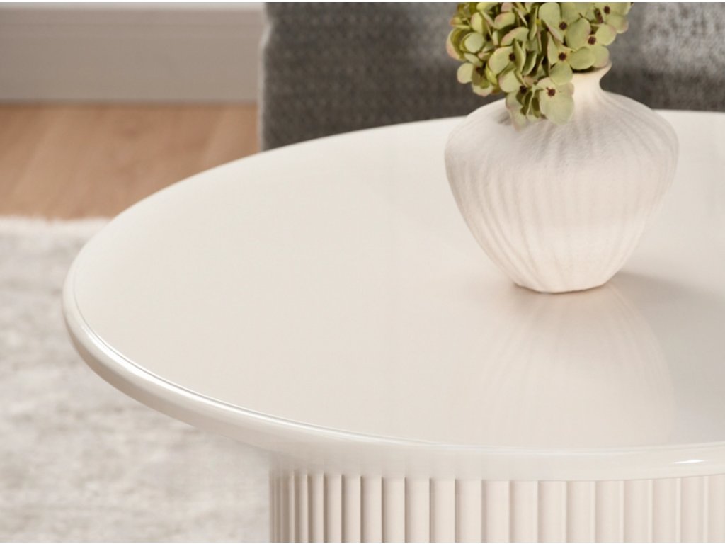 Tento elegantný okrúhly stôl s drážkami a priemerom dosky 80 cm priťahuje pozornosť svojím moderným dizajnom a jemnou krémovo bielou lesklou povrchovou úpravou. Vytvorte si útulnú atmosféru vo svojej obývačke, kancelárii alebo spálni investíciou do kúska, ktorý kombinuje štýl s praktickosťou.