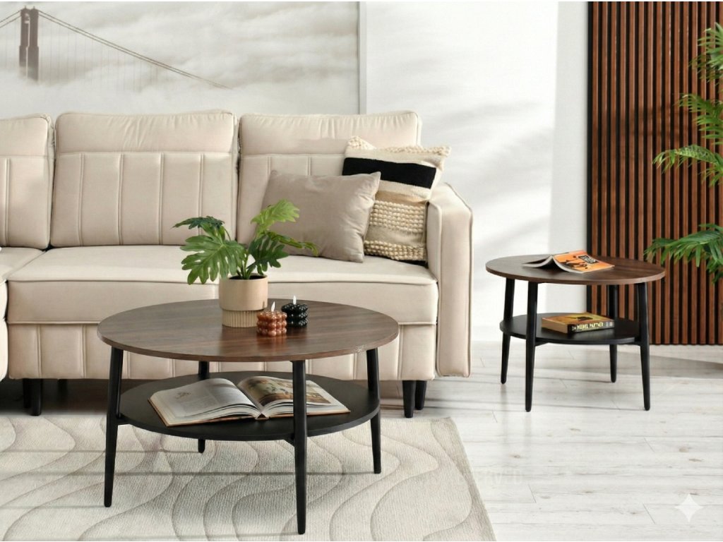 Doska stola, vyrobená z odolnej laminovanej dosky s textúrou orechovej , sa ľahko udržiava a je odolná voči každodennému používaniu. Jej veľká plocha bez problémov pojme všetko, čo potrebujete na relax – od kávových súprav až po dekorácie a knihy.