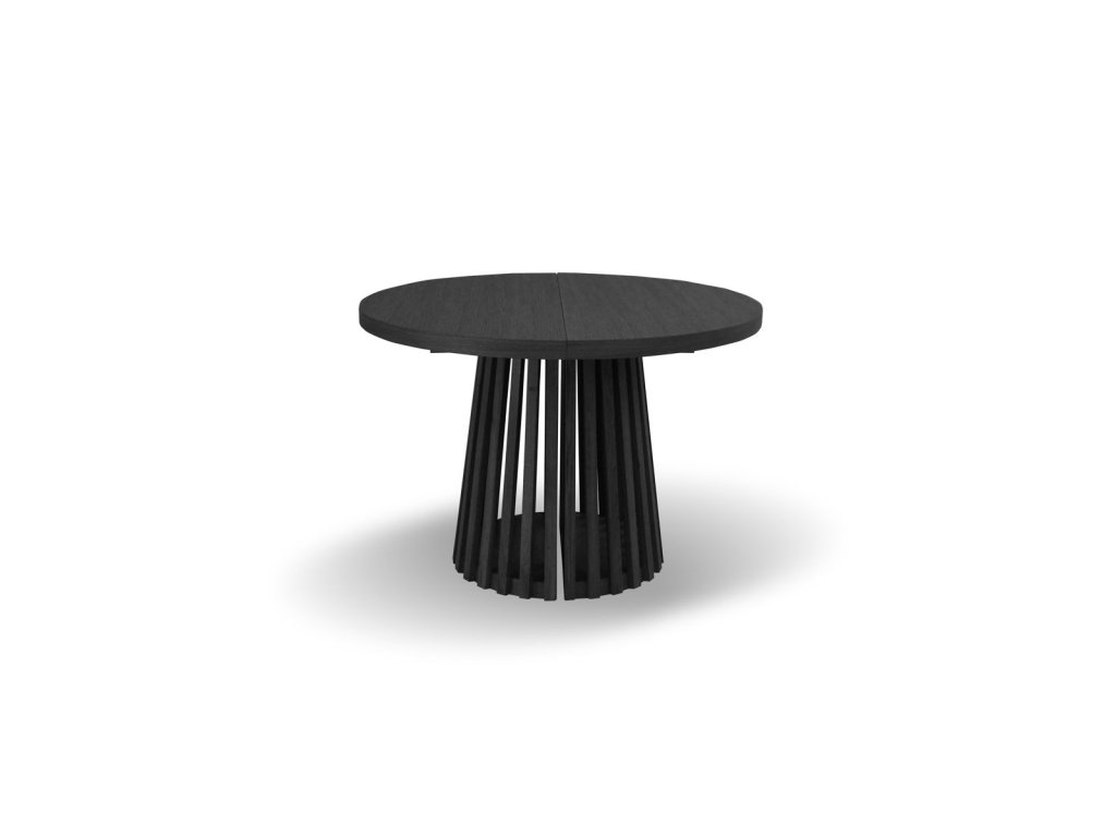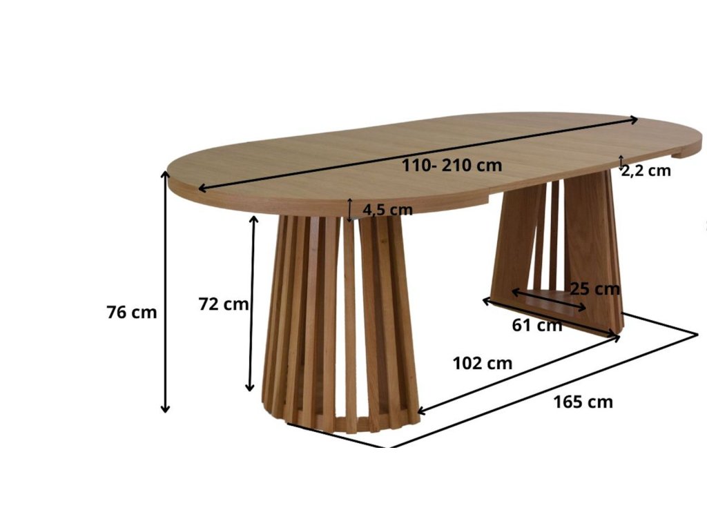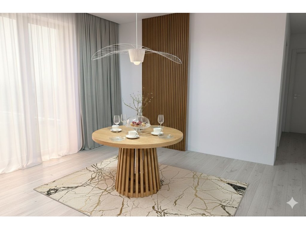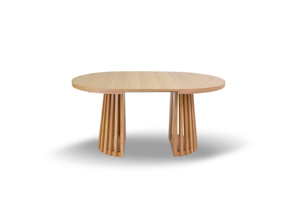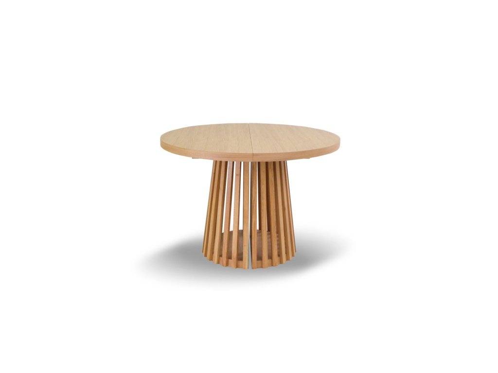 Okrúhly rozkladací jedálenský stôl MERINO s doskou z dubovej dyhy prináša spojenie prírodného vzhľadu a funkčnosti. Stôl je vybavený dvomi rozkladacími vložkami, vďaka ktorým jednoducho zväčšíte jeho kapacitu pre viac osôb. Dizajnová lamelová podnož z masívneho dreva dodáva stolu stabilitu a moderný charakter vhodný do každého interiéru.