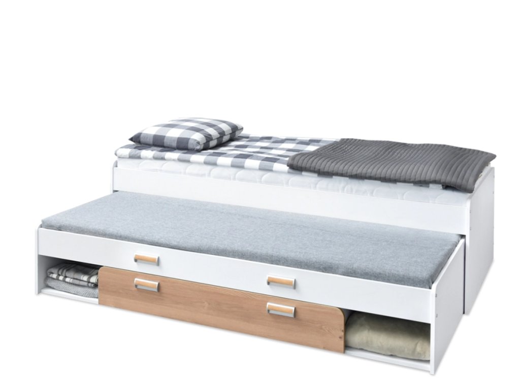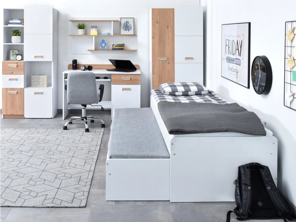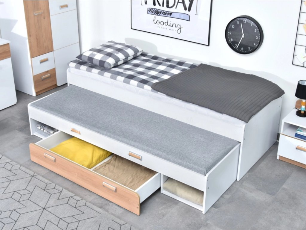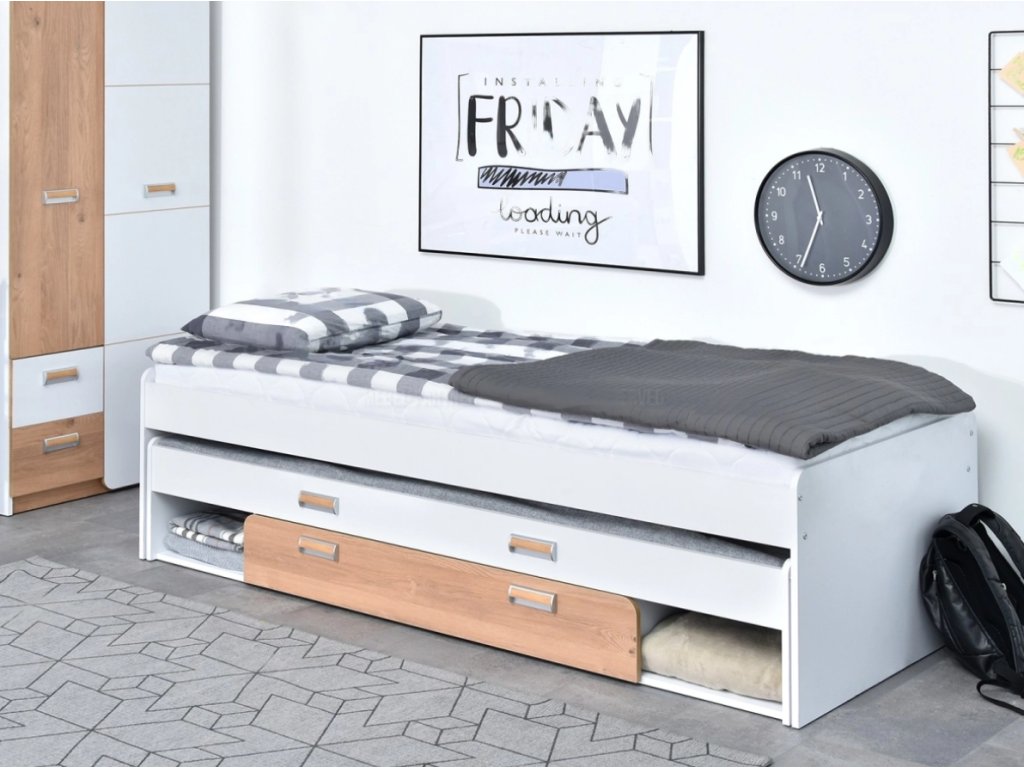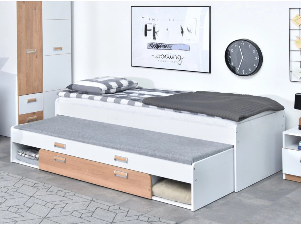 Moderné farby v jemných a príjemných tónoch prírodného dubu a bielej dokonale rozžiaria a zútulnia každý interiér. Dvojlôžková poschodová posteľ s výsuvným druhým matracom bude skvelým riešením pre malú izbu, ktorá poskytne ďalší priestor na spanie. Ďalšou výhodou nábytku je vyberateľná priestranná zásuvka na kolieskach , ktorá perfektne splní svoju úlohu kontajnera na lôžkoviny alebo iné potrebné veci. Na oboch stranách zásuvky sú praktické priehlbiny na drobnosti , vďaka ktorým udržíme v miestnosti poriadok. Celý korpus a čelo sú vyrobené z pevnej kvalitnej laminovanej nábytkovej dosky , ktorá bude slúžiť dlhé roky, úchytky sú vyrobené z masívneho plastu .