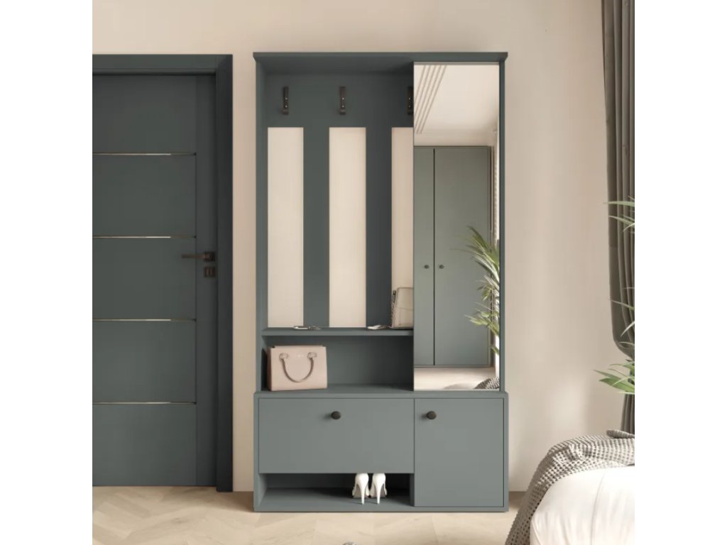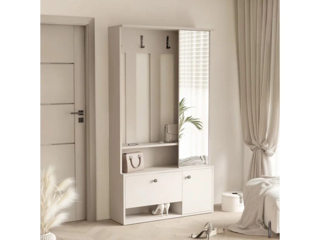 Táto šatňa je vybavená funkčným vešiakom na kabáty , úložným priestorom na topánky a veľkým zrkadlom , čo umožňuje rýchlu prípravu a opticky zväčšuje priestor. Zrkadlo nie je len praktickým prvkom, ale zdôrazňuje aj moderný charakter nábytku.