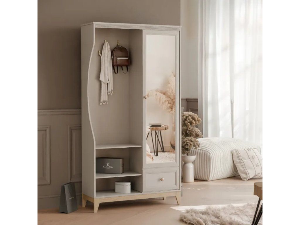 Šatňa je vybavená funkčnými policami , ktoré vám umožňujú jednoducho usporiadať priestor a usporiadať každodenné doplnky – topánky, kabelky, klobúky a šatky. Zrkadlo na prednej strane slúži nielen praktickej funkcii, ale aj opticky zväčšuje a rozjasňuje miestnosť , čím dodáva chodbe elegantný a priestranný pocit.