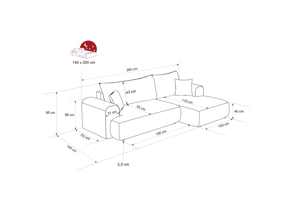 - funkcia spania vám umožňuje ľahko premeniť rohovú pohovku na pohodlnú posteľ