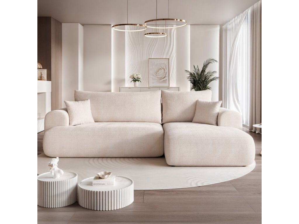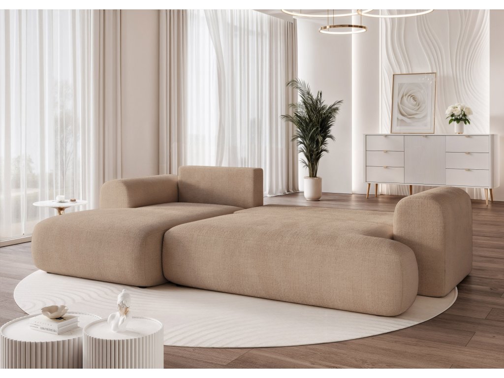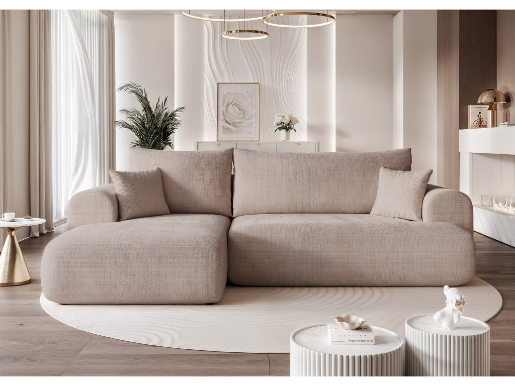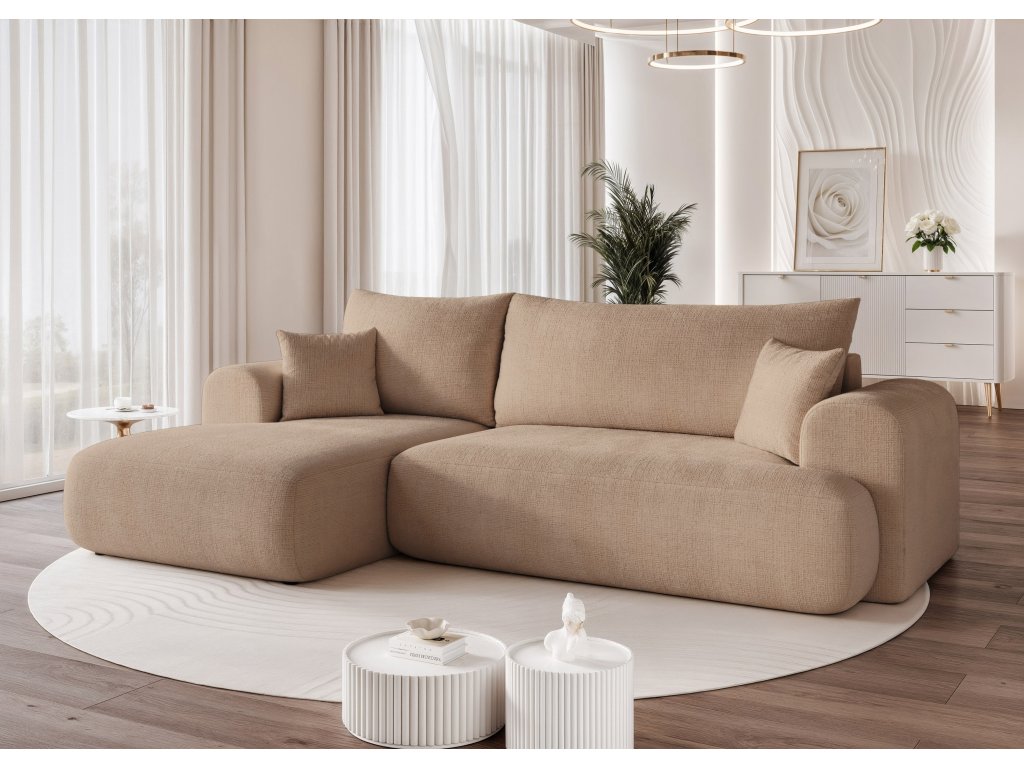 Štýlová čalúnená rohová pohovka s funkciou spania a úložným priestorom na posteľnú bielizeň, ktorá sa vďaka univerzálnemu nastaveniu a možnostiam látok perfektne hodí do modernej obývačky.