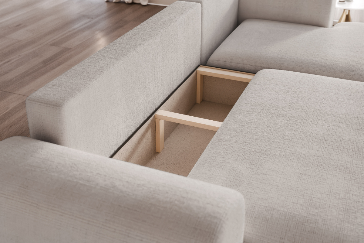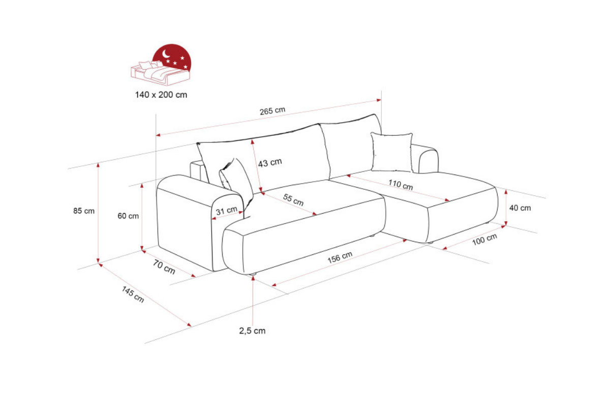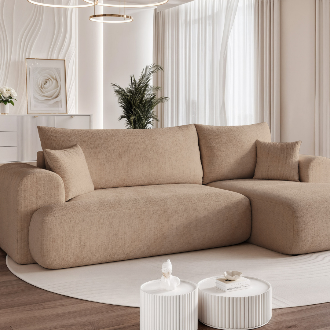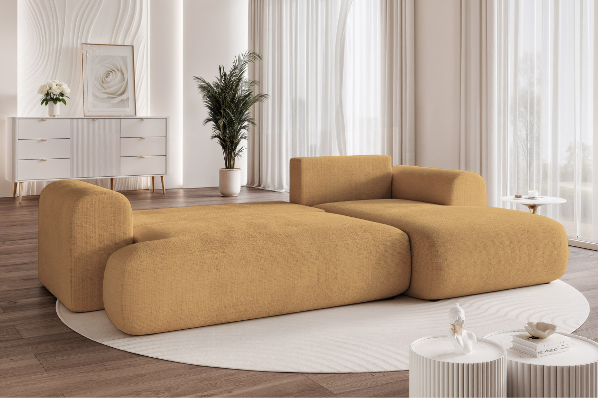 Štýlová čalúnená rohová pohovka s funkciou spania a úložným priestorom na posteľnú bielizeň, ktorá sa vďaka univerzálnemu nastaveniu a možnostiam látok perfektne hodí do modernej obývačky.