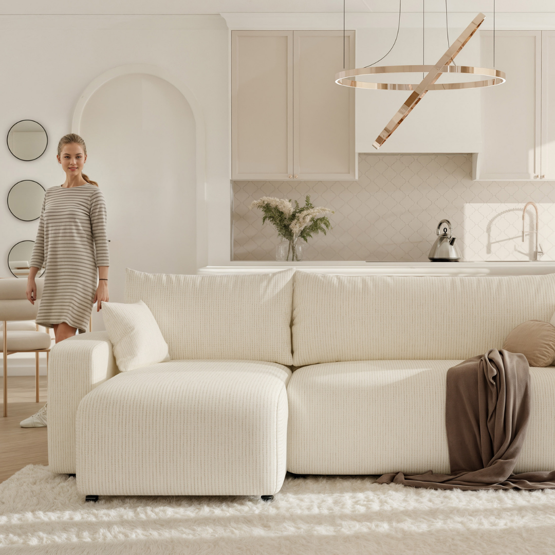 Rohový gauč má sedák s penou T30 a vlnitými pružinami - sedák pohovky je vybavený penou T30 a vlnitými pružinami, ktoré zaisťujú optimálne pohodlie a dobrú oporu chrbta. Béžová rohová sedačka je tou správnou voľbou pre každého, kto chce spojiť funkčnosť so štýlom.