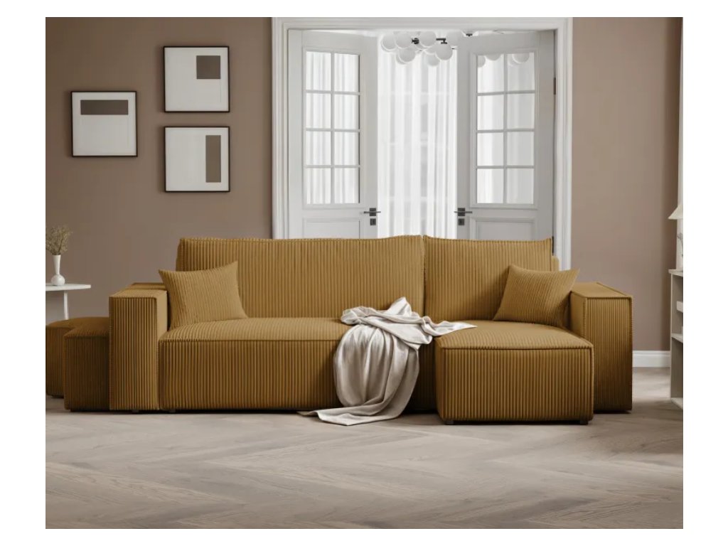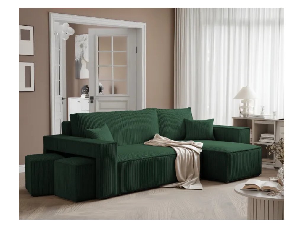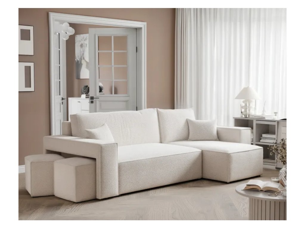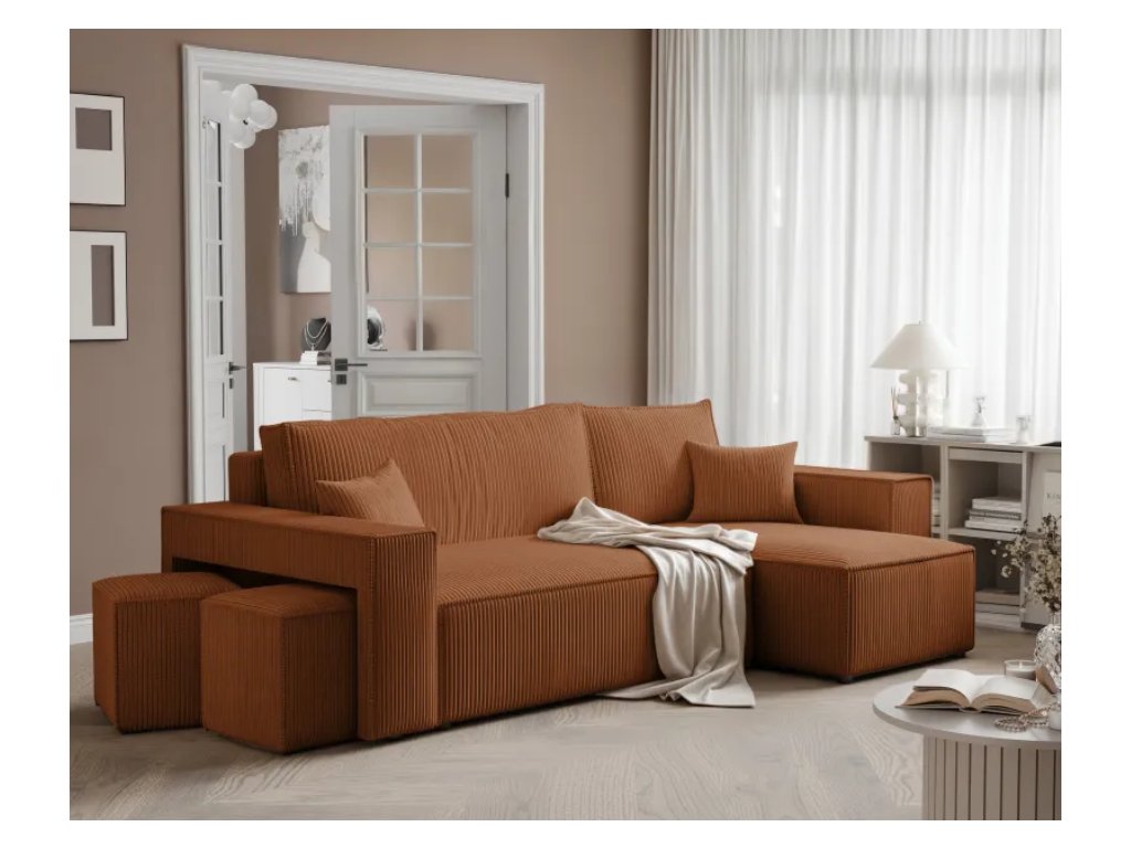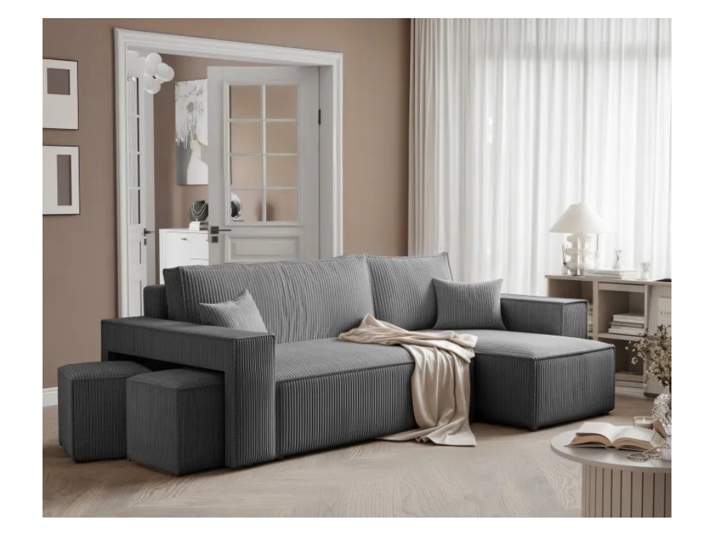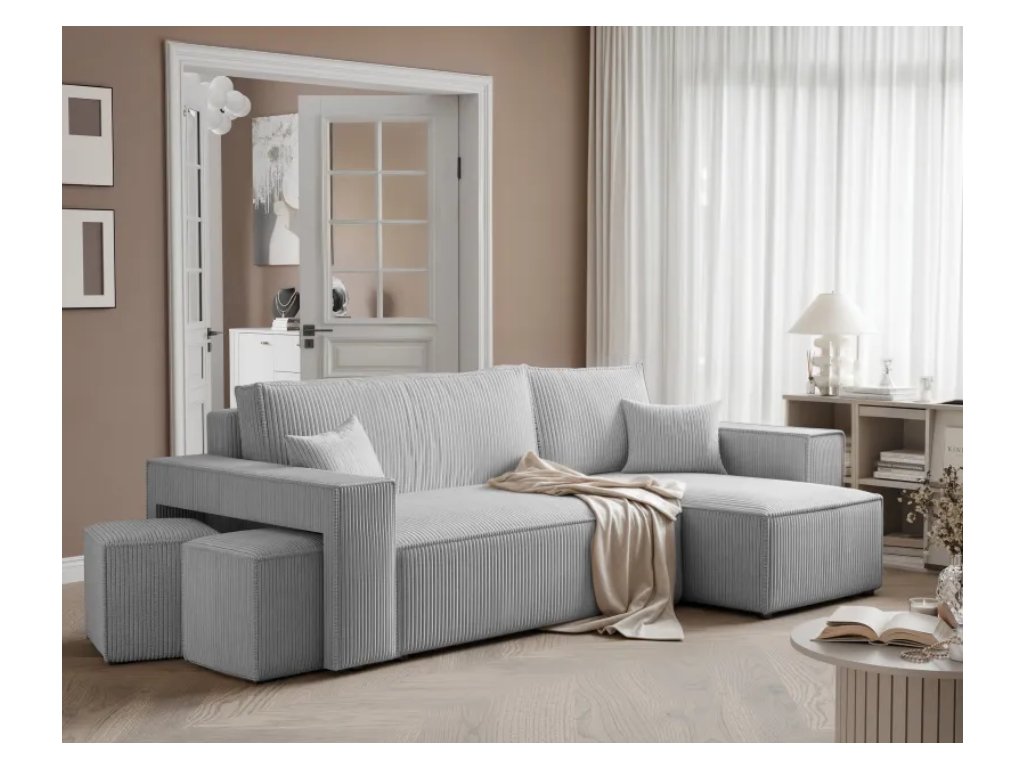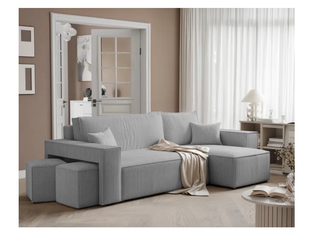 Čalúnená rohová pohovka MILANO XL, vybavená funkciou spania a dvoma funkčnými taburetkami, dodá interiéru praktický akcent.