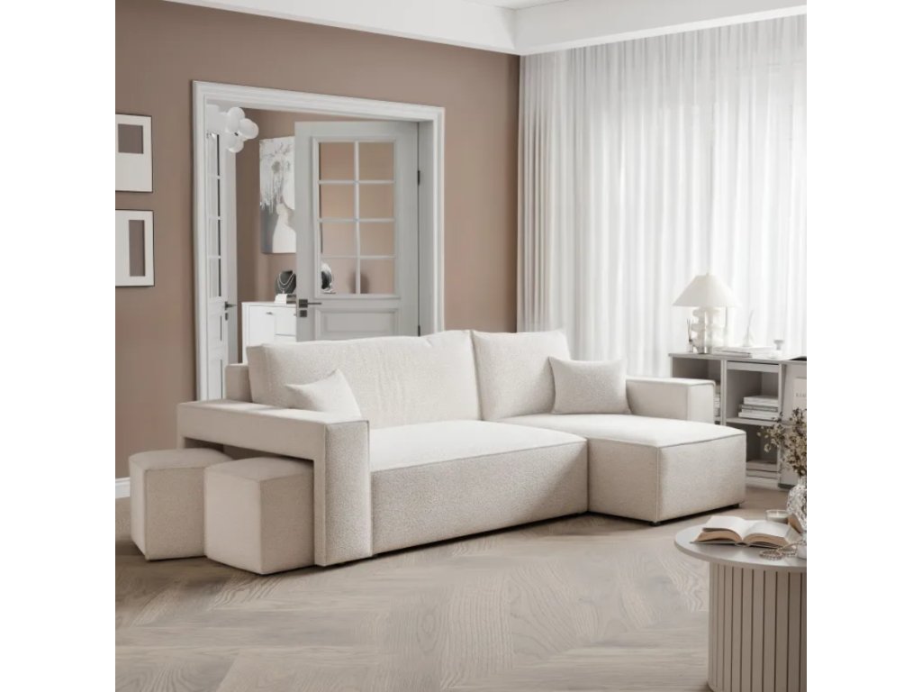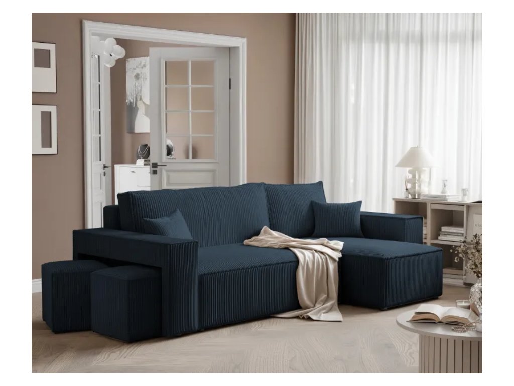 Napriek svojim malým rozmerom ponúka táto rohová pohovka plnohodnotnú funkciu na spanie – pomocou automatického valčekového mechanizmu ju môžete ľahko premeniť na pohodlnú posteľ. Vo vnútri sa nachádza aj praktický priestor na posteľnú bielizeň , do ktorého sa zmestí aj iné predmety, ktoré nechcete mať vonku. Ďalšou výhodou sú dva praktické pufy , ktoré môžu slúžiť ako podnožky, ďalšie sedadlá alebo stolíky – ideálne na stretnutie s hosťami alebo relax po práci.