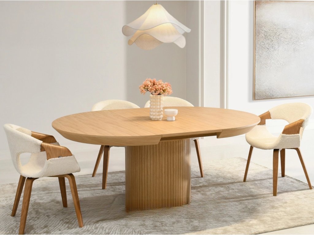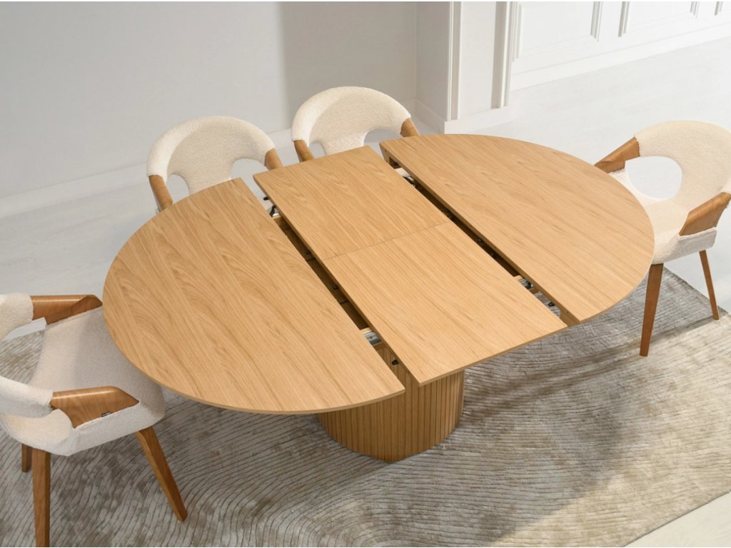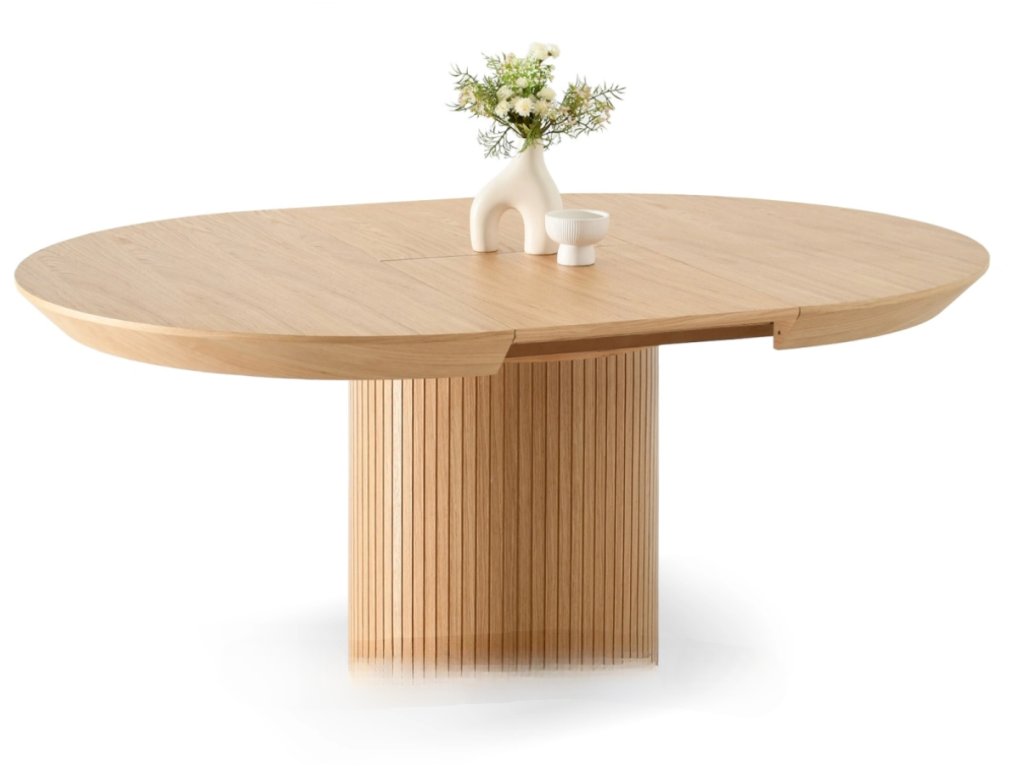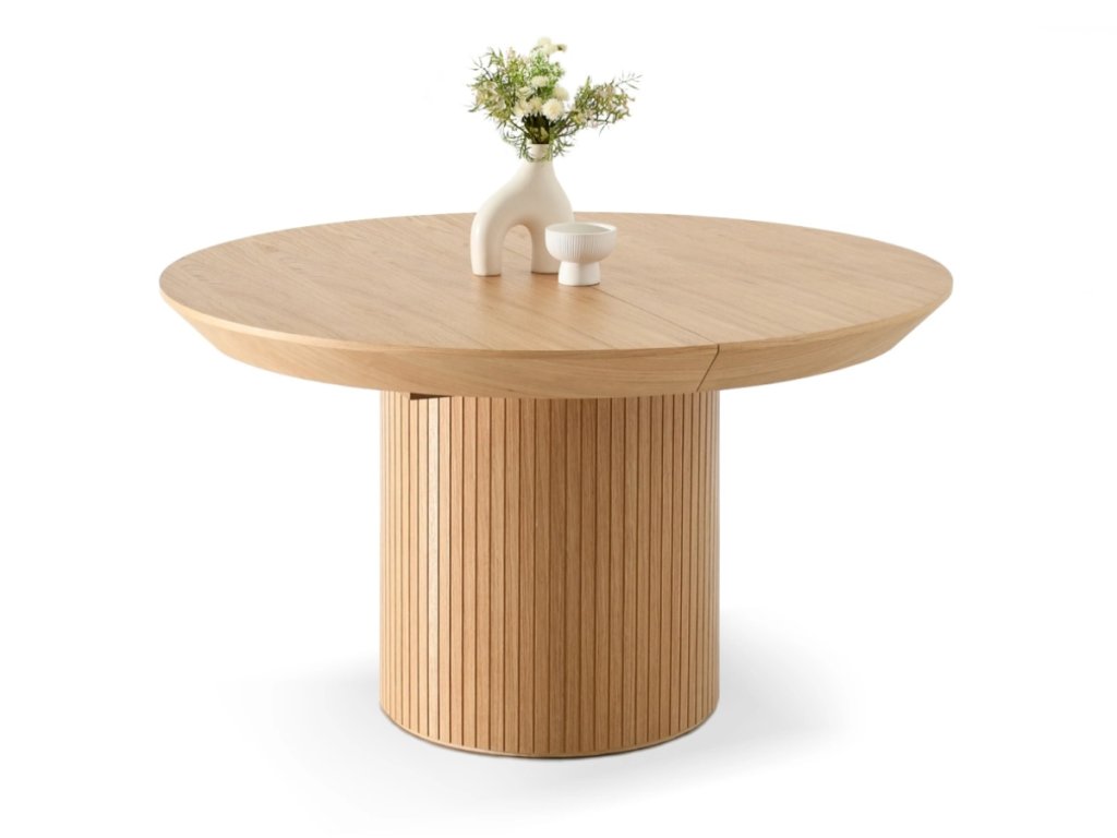 Hľadáte stôl, ktorý kombinuje nadčasový štýl s praktickým riešením? Náš okrúhly stôl ALBERTO je odpoveďou na vaše potreby! Dyhovaná povrchová úprava verne odráža štruktúru dreva a valcová základňa s frézovanou úpravou mu dodáva jedinečný charakter a vytvára efektívny prvok interiérového vybavenia. Vďaka funkcii rozkladania si ho môžete prispôsobiť svojim aktuálnym potrebám - bude sa hodiť ako pri každodennom stravovaní, tak aj pri stretnutiach vo väčšej skupine. Investujte do kusu nábytku, ktorý sa stane srdcom vášho domova. Neodkladajte kúpu!