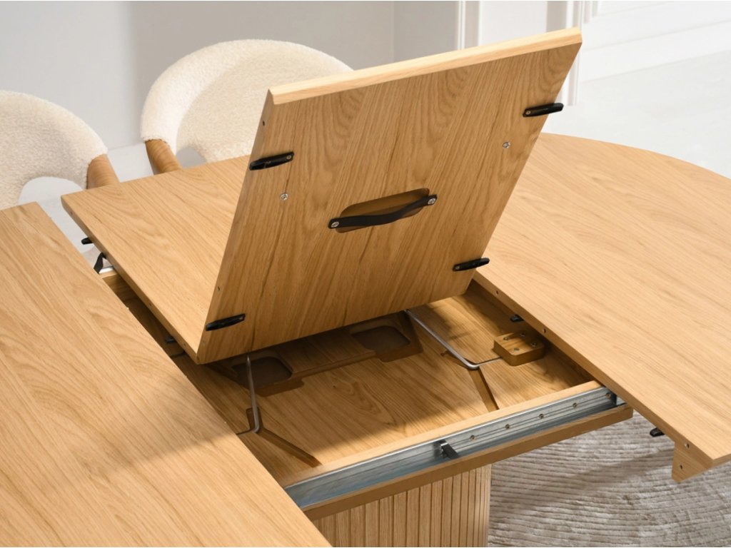 Jedálenský stôl ALBERTO ponúka možnosť roztiahnutia dosky, čo z neho robí mimoriadne funkčný prvok vášho domova. Vďaka použitiu skladacej vložky skrytej pod doskou sa jeho veľkosť dá ľahko zväčšiť na 180 cm, čím sa získa pohodlná, oválna plocha dosky s rozmermi 130x180 cm.