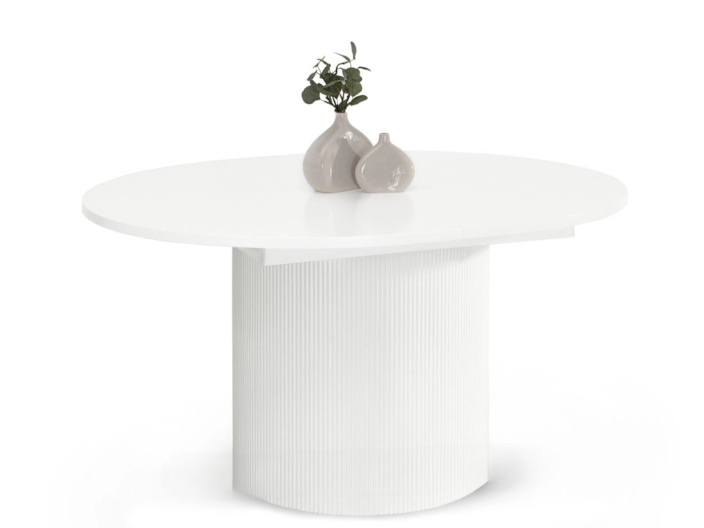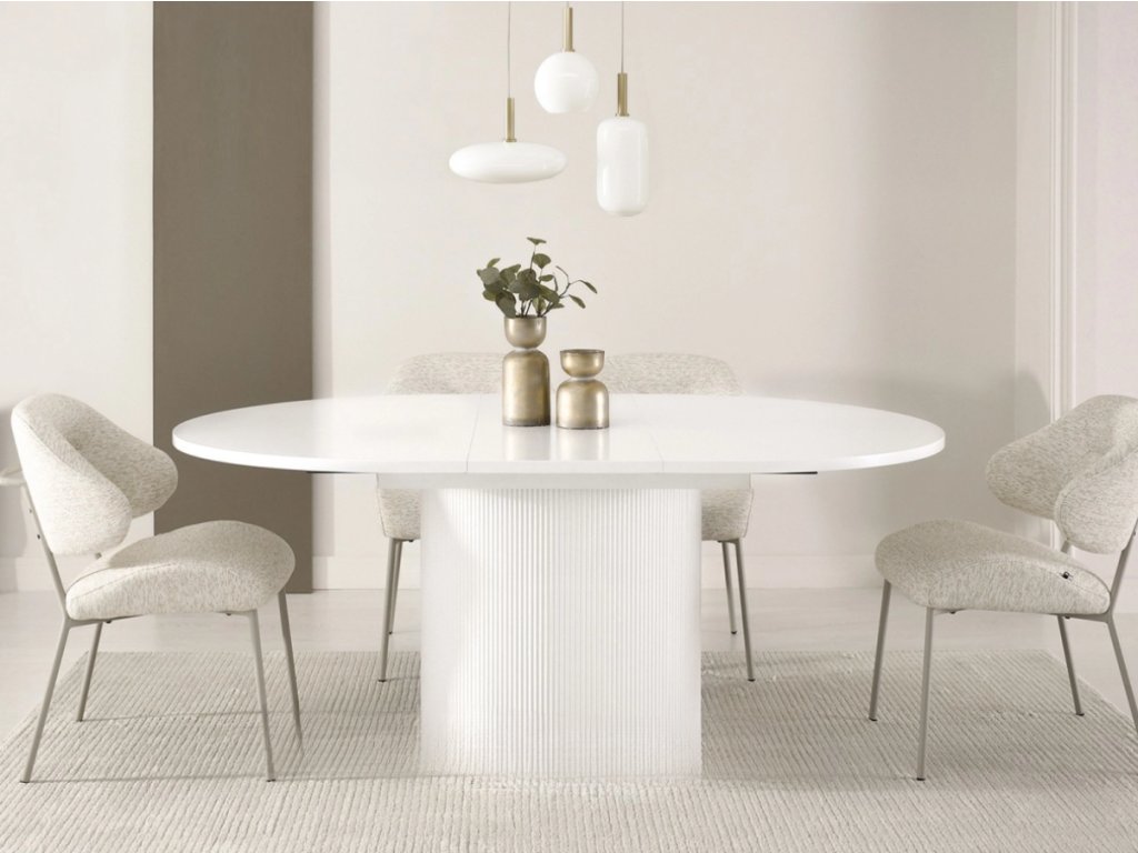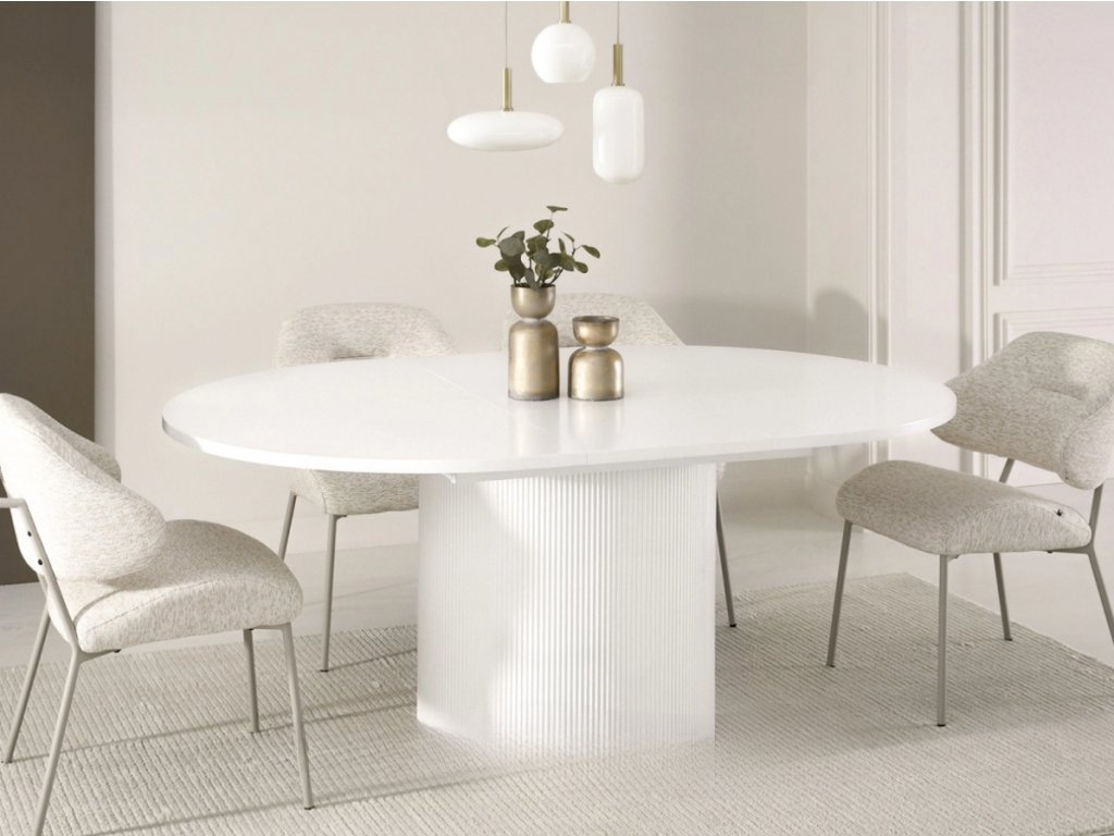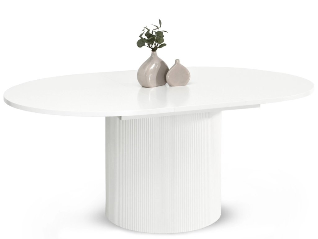 Biely oválny stôl s drážkovanou nohou ALVARO je stelesnením nohou a moderného štýlu. Stôl sa rozkladá neuveriteľne hladko - stačí ho potiahnuť na jednu stranu a rýchlo získate ďalší priestor.