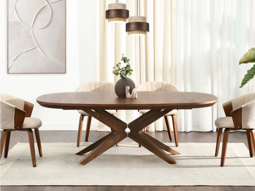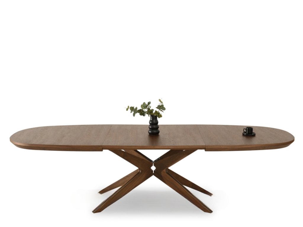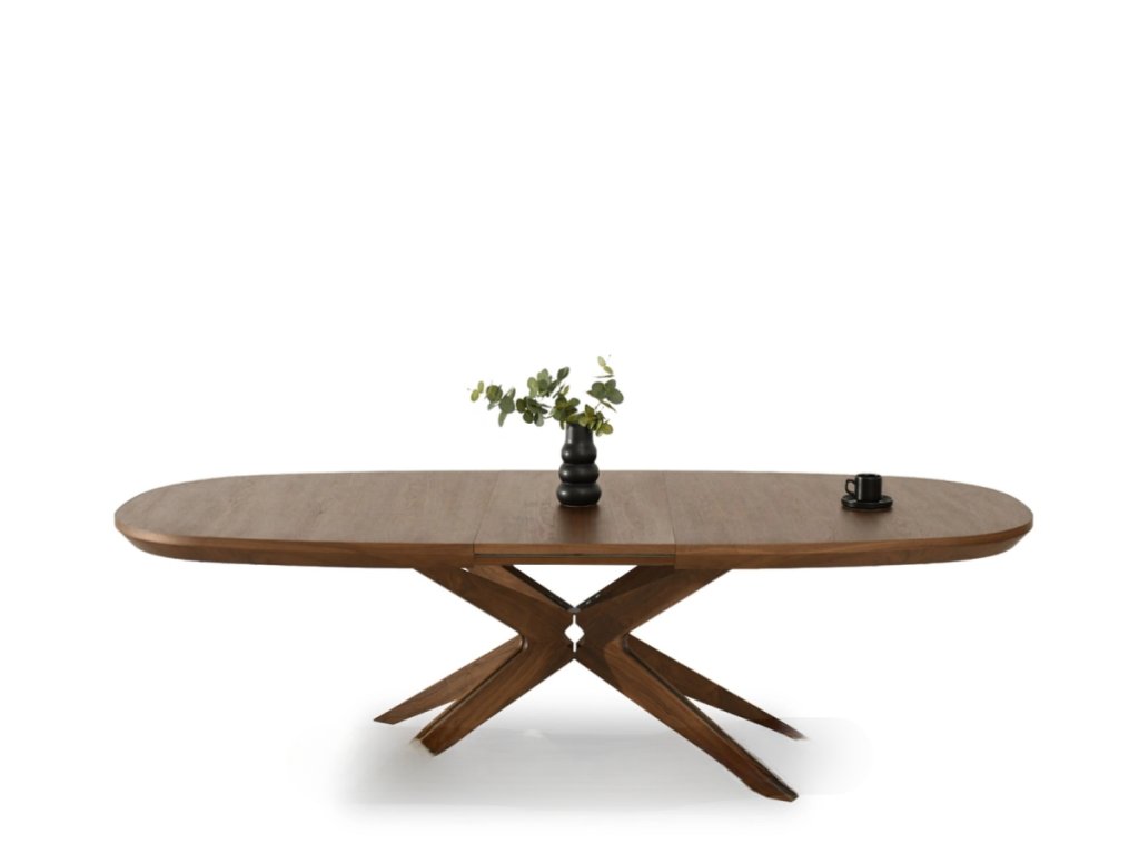 Stôl DALLAS sa vyznačuje efektnou drevenou podnožou s dynamickým, geometrickým tvarom , ktorá priťahuje pozornosť a zdôrazňuje moderný charakter nábytku. Pretínajúce sa nohy vytvárajú pevnú a mimoriadne stabilnú konštrukciu, ktorá zaručuje bezpečné používanie aj pri úplne vysunutej doske. Celok je obohatený o decentnú čiernu vložku , ktorá dodáva eleganciu a kontrastuje s teplým odtieňom dreva. Toto riešenie kombinuje vysokú estetiku s funkčnosťou a vytvára štýlový akcent v jedálni alebo obývačke.