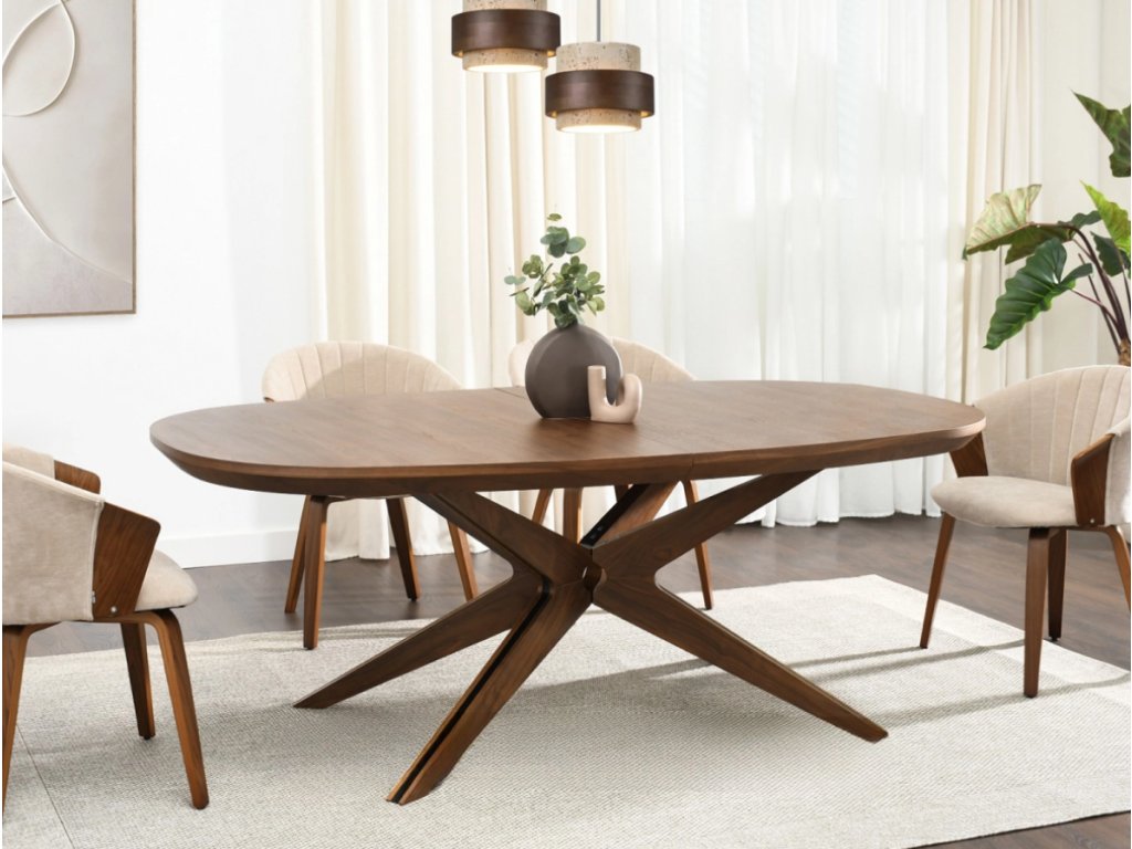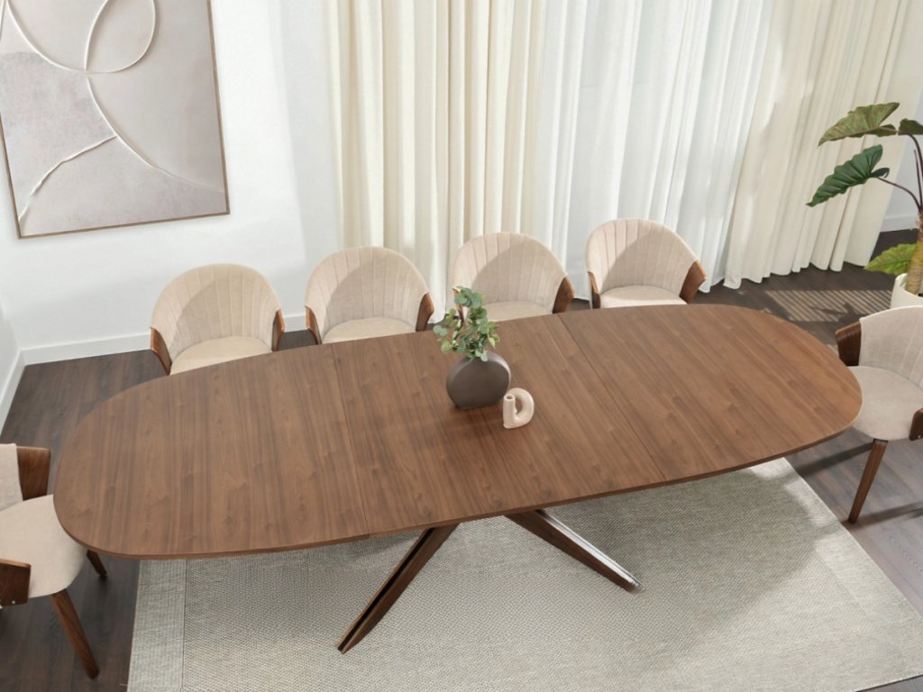 Stôl DALLAS zaujme svojou oválnou doskou z dyhovanej dosky v elegantnej orechovej farbe . Prirodzená štruktúra dreva je jasne viditeľná a dodáva celku autentický, ušľachtilý charakter. Jemne vnímateľná povrchová štruktúra pod prstami umocňuje dojem kontaktu s prírodným materiálom. Takáto doska nielenže vyzerá krásne, ale do interiéru prináša aj teplo a útulnosť . Ide o riešenie, ktoré spája estetiku s odolnosťou a funkčnosťou.
