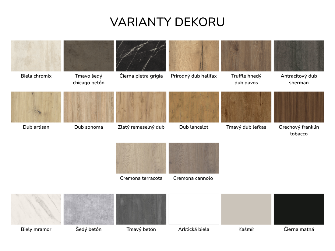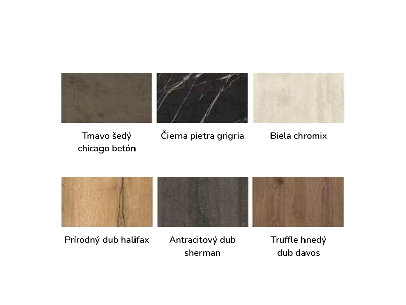 | Dekory dosky (výber) | Tmavo šedá Chicago, Čierna Pietra Grigia, Biela Chromix, Prírodný dub Halifax, Antracitový dub Sherman, Truffle hnedá |