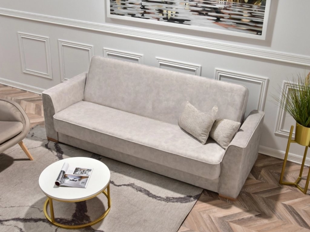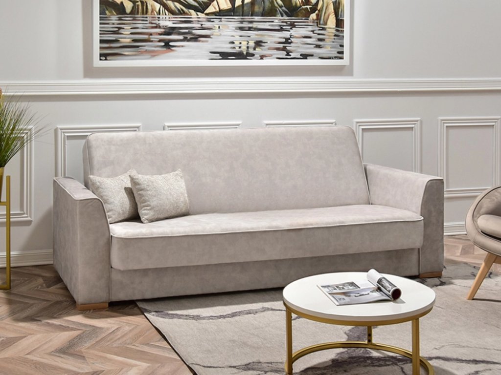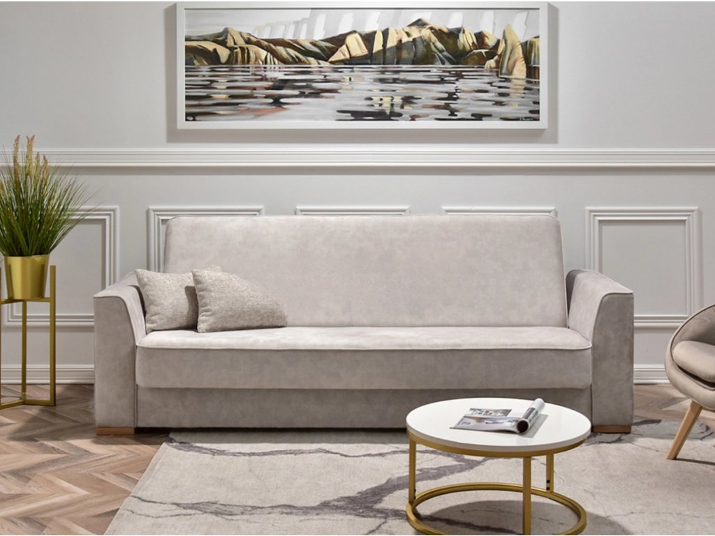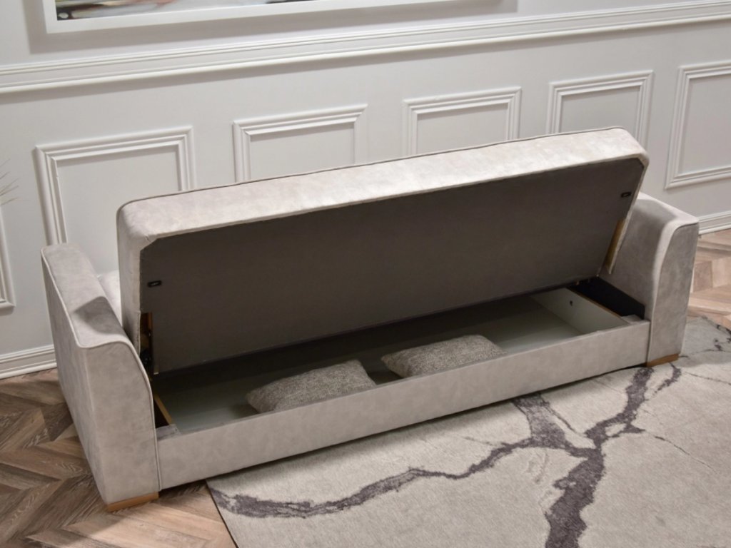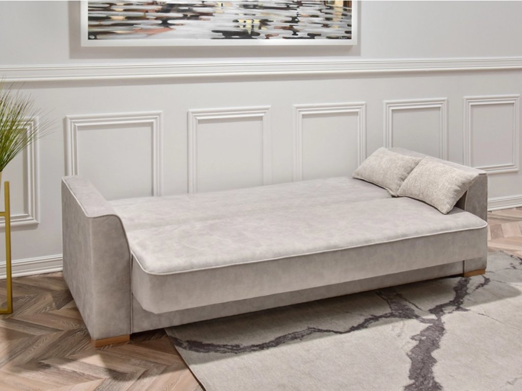 Model ANGELO je tiež vybavený rozkladacím systémom s mechanizmom clic-clac, vďaka ktorému je príprava plochy na spanie rýchla a veľmi jednoduchá pri každodennom používaní. Okrem toho má produkt nádobu, ideálnu na posteľnú bielizeň. Pohovka je určená na umiestnenie pri stene, pretože jej operadlo je čalúnené technickou látkou (sivý wigofil). Za príplatok je možné čalúniť operadlo aj hlavnou látkou.