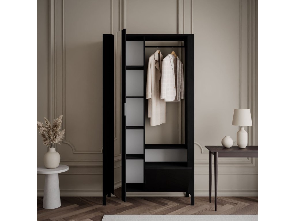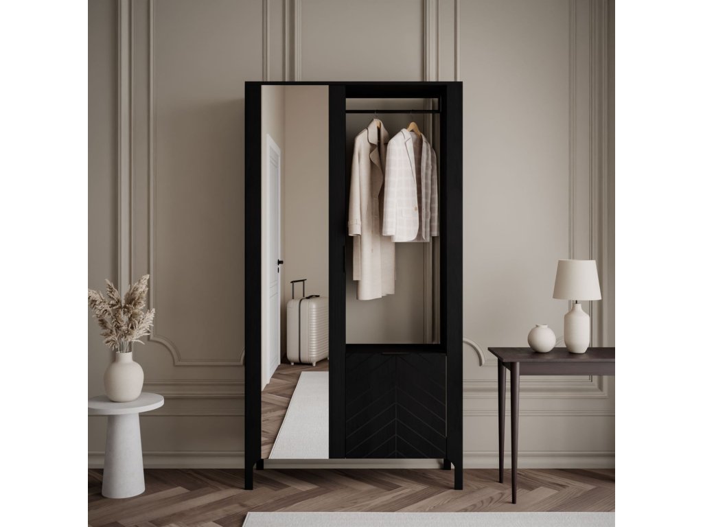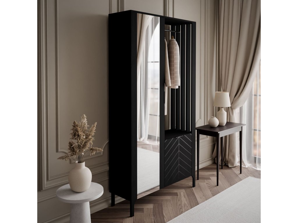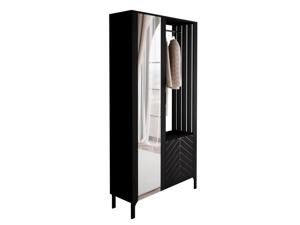 Moderná a praktická šatníková skriňa, ktorá dokonale kombinuje súčasný dizajn s jednoduchým používaním. Je vyrobená z pevných materiálov, zaujme svojou jednoduchou formou a všestrannou farebnou schémou, ktorá harmonicky dopĺňa rôzne interiérové štýly. Veľké vertikálne zrkadlo na prednej strane opticky rozjasňuje priestor a umožňuje rýchle vybavenie pred odchodom. Otvorená časť s vešiakovou tyčou je ideálna na organizovanie kabátov, búnd a bežného oblečenia. Spodná uzamykateľná skrinka s dekoratívnym vzorom umožňuje diskrétne uloženie topánok, kabeliek a ďalších dôležitých doplnkov. Odolná konštrukcia zaisťuje stabilitu a dlhú životnosť. Tmavá čierna farba šatníkovej skrine jej dodáva moderný a elegantný charakter, zatiaľ čo matný povrch zdôrazňuje jej rafinovaný štýl. Tmavá farebná schéma dodáva tomuto kusu nábytku mimoriadne pôsobivý vzhľad a hodí sa do rôznych interiérov – od minimalistických až po industriálne.