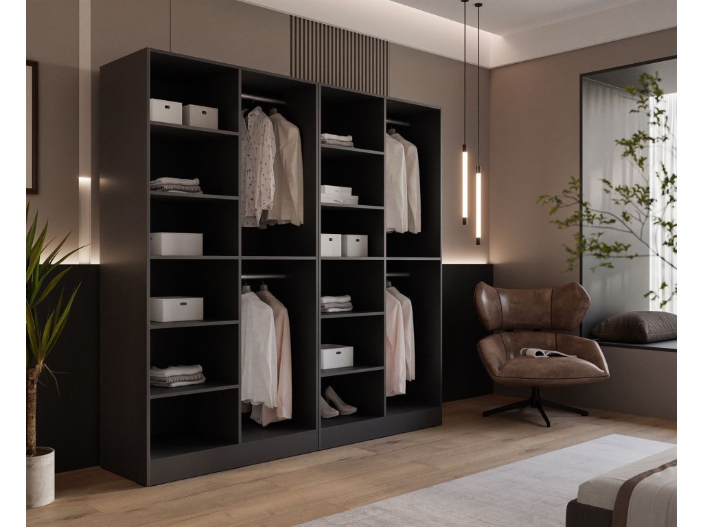 Vďaka vnútornému usporiadaniu šatníka je mimoriadne priestranná a funkčná . Obrovský priestor úspešne pojme všetko potrebné, čo vám umožní zostať v poriadku. Vnútro skrine obsahuje množstvo políc , výklenok s pripevnenou tyčou na vešiaky a dve priestranné zásuvky. Toto riešenie znamená, že do šatníka sa perfektne zmestí ako elegantné oblečenie zavesené na vešiakoch, tak aj oblečenie poskladané do kociek.