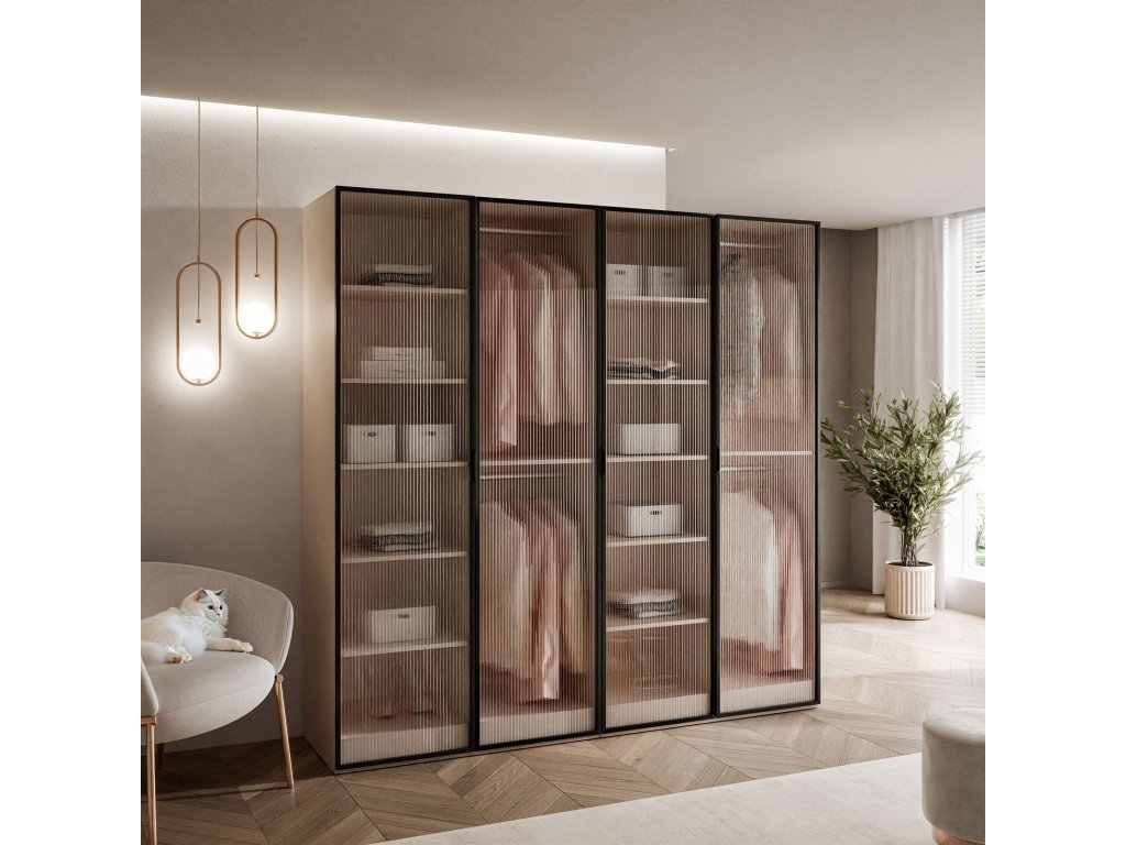 Charakteristickým znakom šatníkovej skrine ALISIA je možnosť personalizácie jej čela , čo vám umožní dokonale zladiť nábytok s charakterom vášho interiéru. Môžete si vybrať úplne pevnú prednú časť , čo je klasické riešenie, ktoré zaisťuje maximálnu diskrétnosť a minimalistický, decentný vzhľad, ktorý sa hodí ku každému štýlu aranžovania. Pre ľudí, ktorí oceňujú kombináciu funkčnosti a moderného dizajnu, bude výbornou voľbou polopresklená predná časť, ktorá umožňuje jemné zobrazenie vybraných obsahových prvkov. Celo presklená predná časť je zase návrhom pre milovníkov moderného otvoreného štýlu, ktorý umožňuje úplné odhalenie interiéru šatníka elegantným a štýlovým spôsobom.