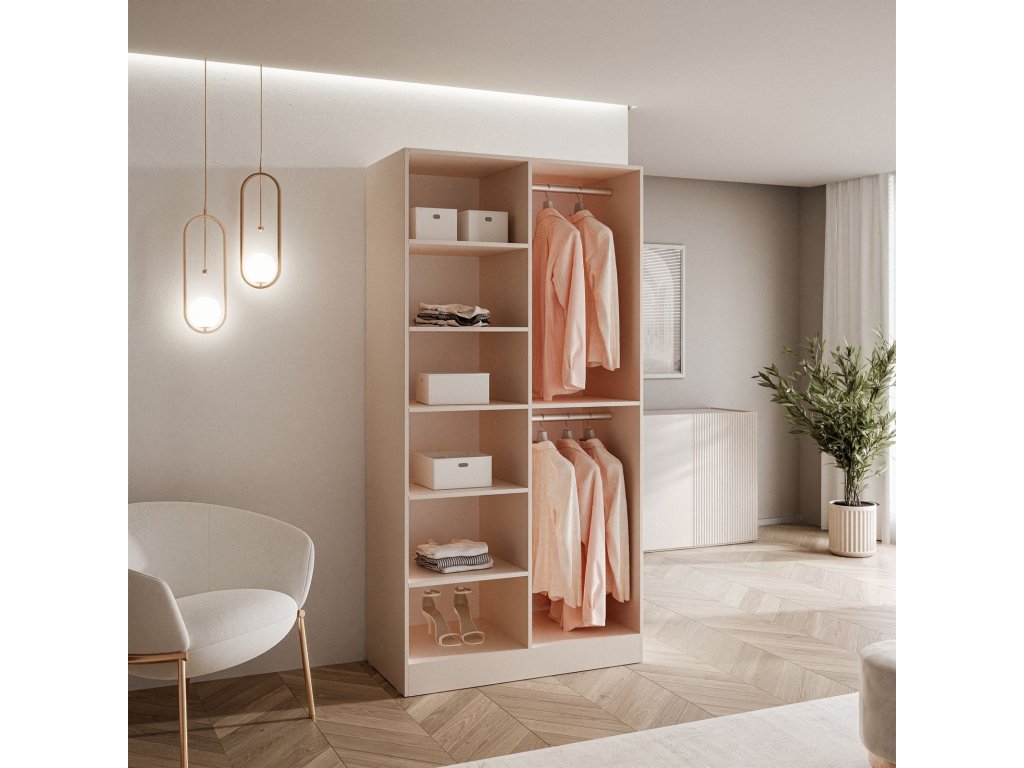 Vnútorné usporiadanie šatníka ho robí mimoriadne priestranným a funkčným. Obrovský priestor úspešne pojme všetko potrebné, čo vám umožní zostať v poriadku. Vnútro skrine obsahuje množstvo políc , výklenok s pripevnenou tyčou na vešiaky a dve priestranné zásuvky. Toto riešenie znamená, že do šatníka sa perfektne zmestí ako elegantné oblečenie zavesené na vešiakoch, tak aj oblečenie poskladané do kociek.