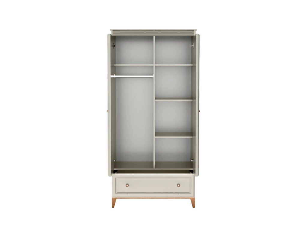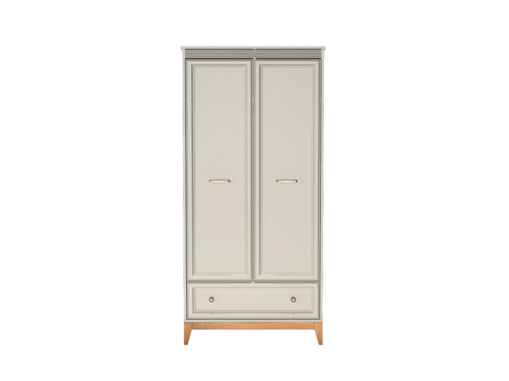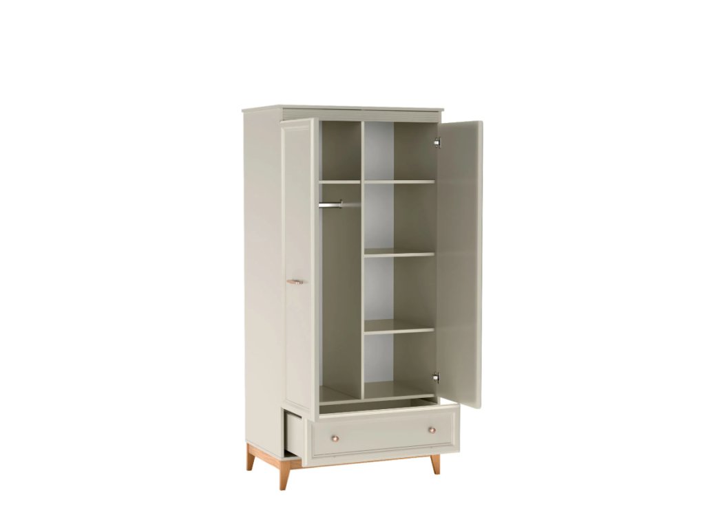 Vďaka dvojdverovému dizajnu ponúka skriňa priestranný úložný priestor na oblečenie, zatiaľ čo ďalšia spodná zásuvka poskytuje miesto na menšie doplnky. Decentné úchytky a jemné frézovanie na predných stranách mu dodávajú jedinečný charakter .