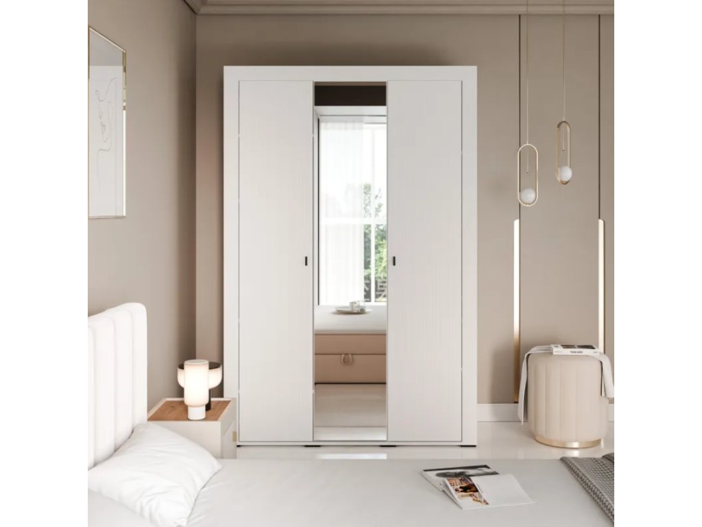 Šatníková skriňa BOXTON so zrkadlom je štýlový a funkčný kus nábytku, ktorý kombinuje priestranný úložný priestor s praktickým zrkadlom pre jednoduché každodenné používanie.